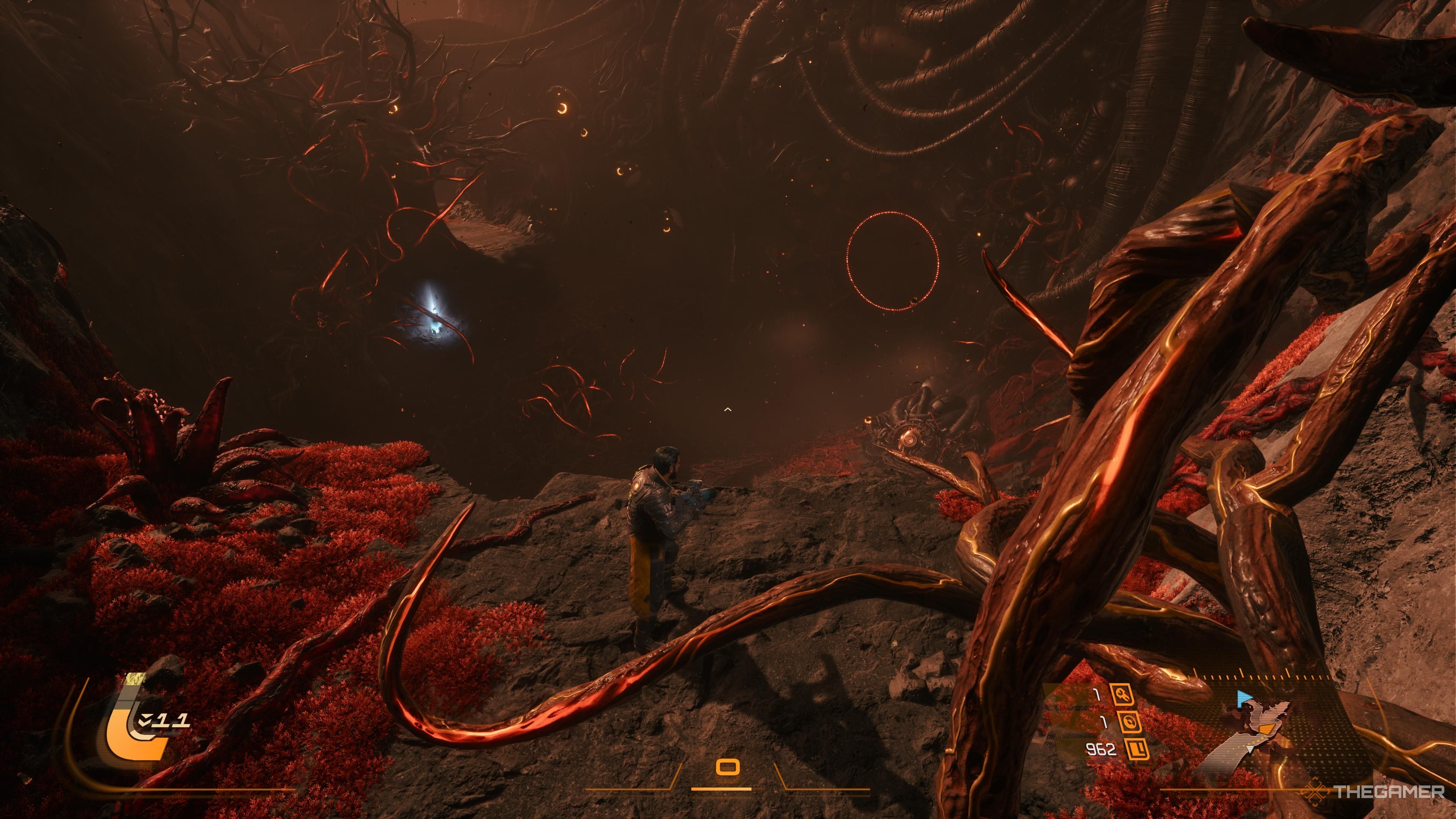 Продолжайте двигаться, пока не активируете телепорт, и он вернет вас к воротам, с которых вы начали. Затем подойдите к светящемуся резервуару справа и взаимодействуйте с ним — это откроет ворота.