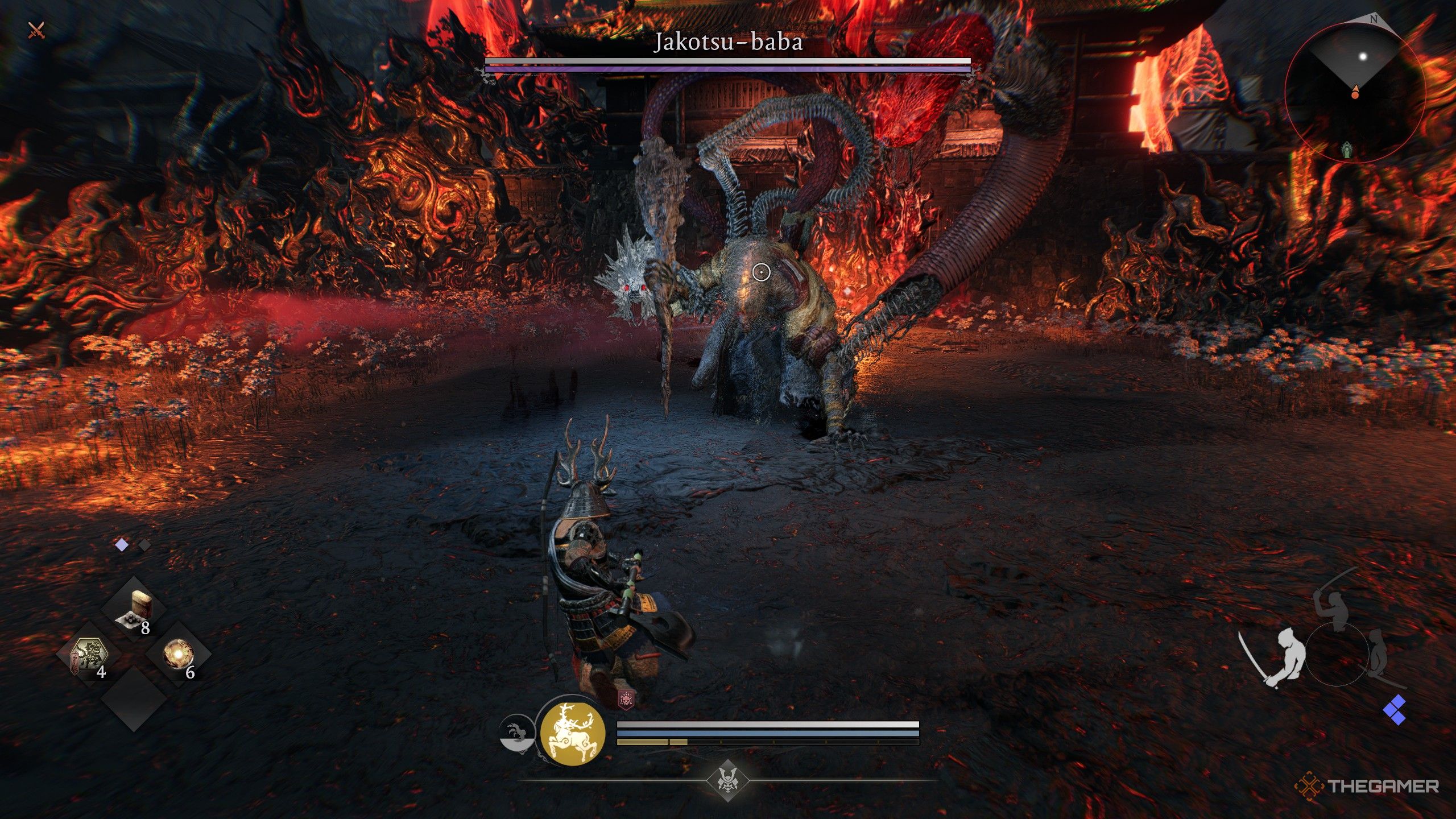 В начале битвы будьте осторожны с атаками Jakostu-baba, которые приходят с расстояния. Она будет стрелять красной змеёй, изрыгающей огонь прямо перед собой – вы можете либо перекатиться мимо неё, либо отойти достаточно далеко, чтобы избежать её. Она также посылает плавающие черепа, которые преследуют вас, но вы можете блокировать их, находясь в форме самурая, или быстро оббегать их, поскольку они поворачиваются медленно.