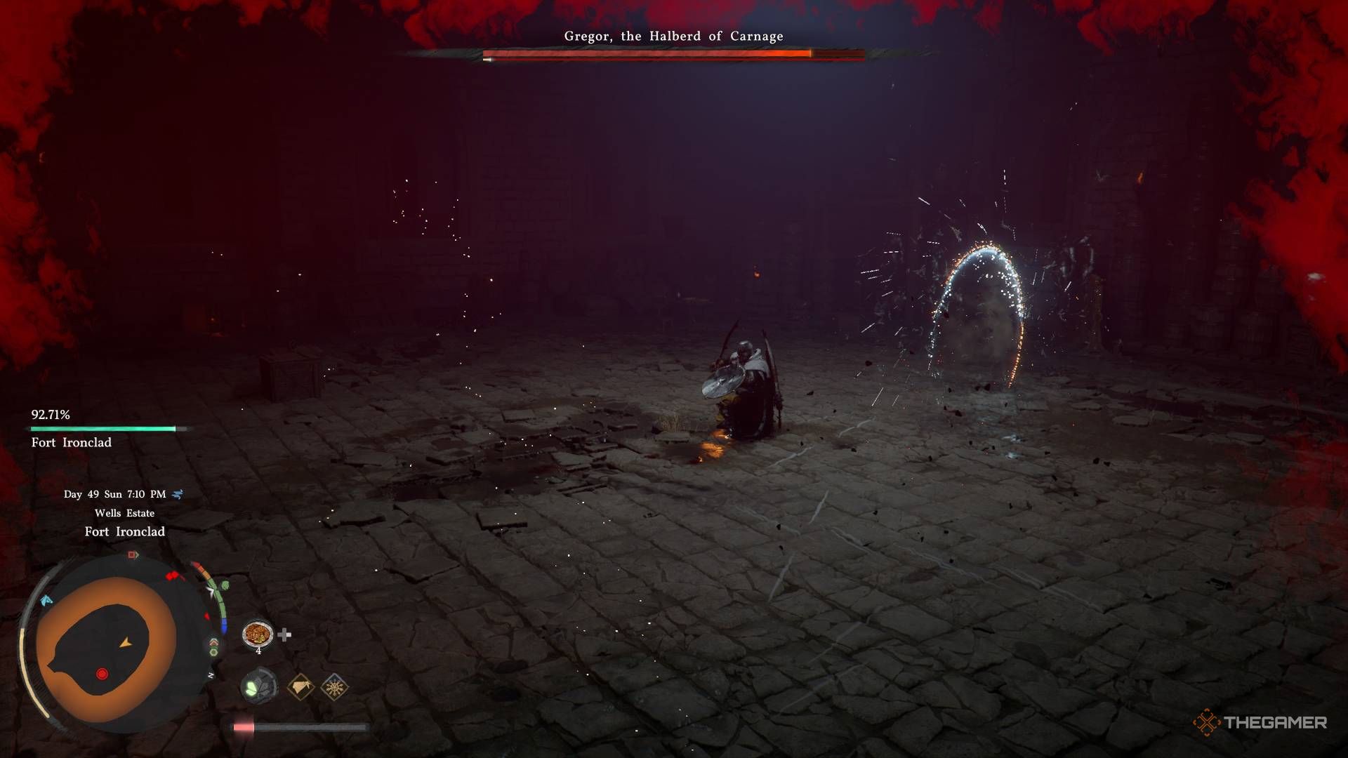 Я не был уверен, что это вызвало, но Грегор иногда выполняет мощную атаку, где он наносит вам удар, прижимает к земле, а затем наступает на вас. Я понял, что единственный способ выжить — это блокировать или отражать каждую атаку, потому что если он попадает этим приёмом, он забирает около трёх четвертей вашего здоровья!