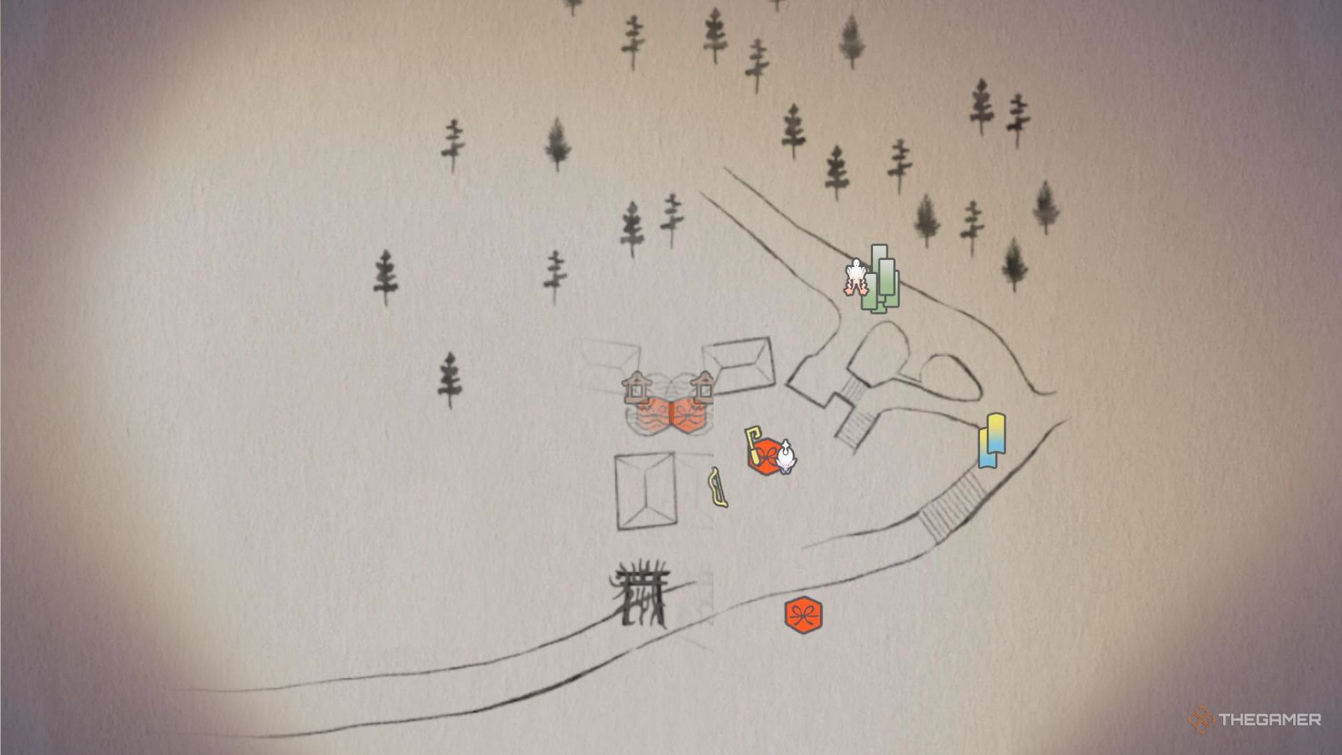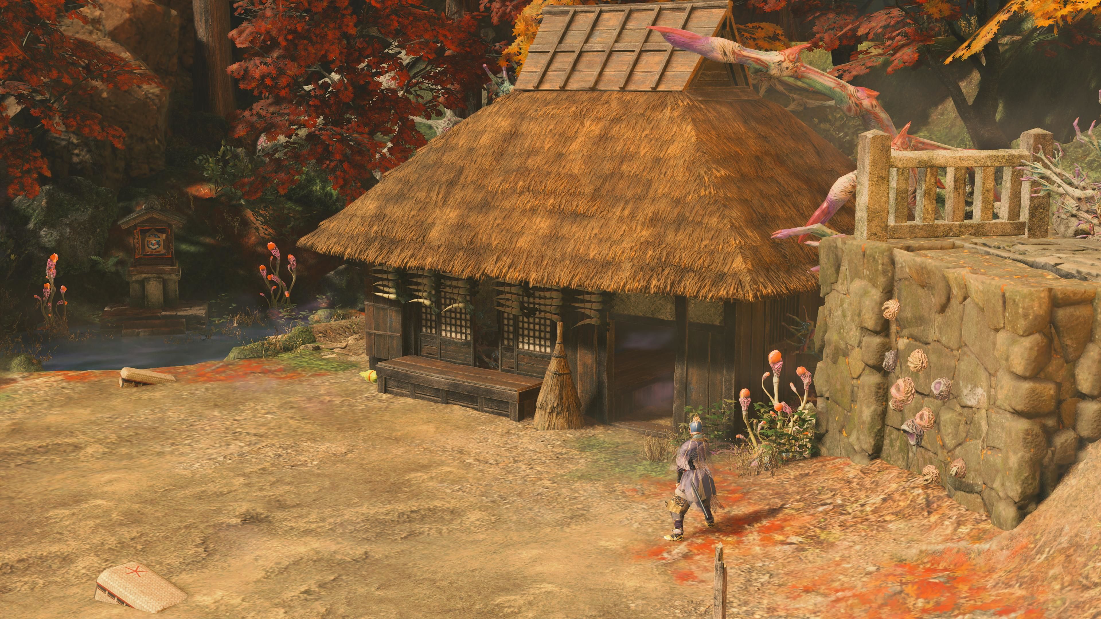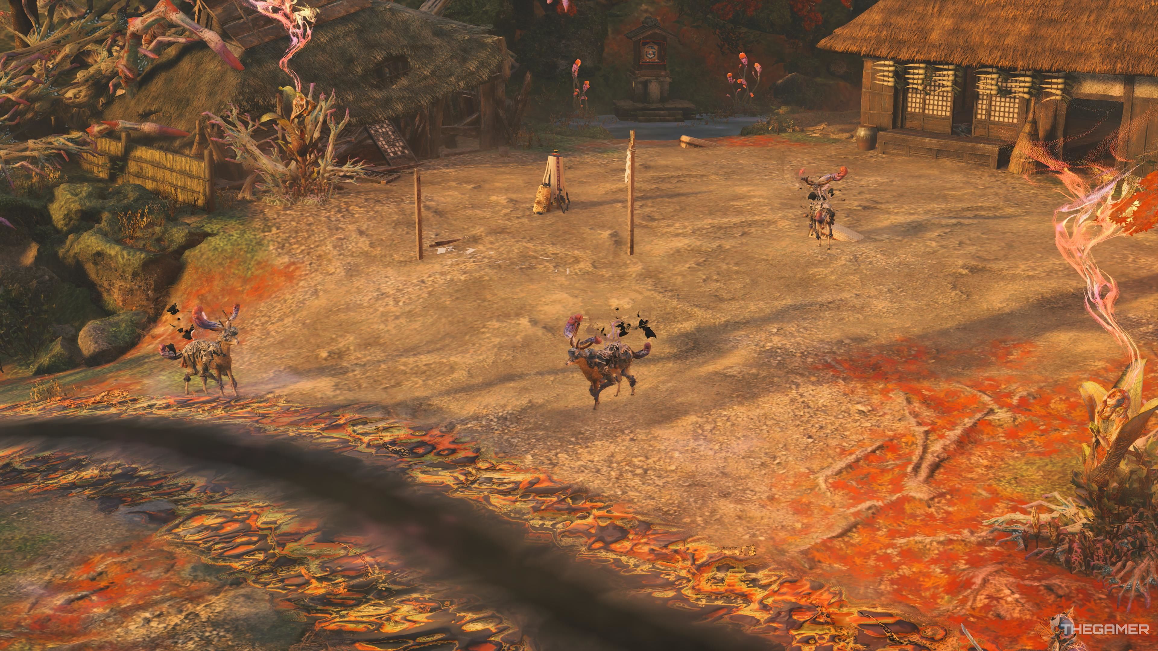 - Очистите 5 диких животных. На главной тропе есть два оленя, которые змеятся по периметру сцены. На поляне (возле дома с соломенной крышей) есть еще три оленя, а возле ворот Тории — еще один олень.