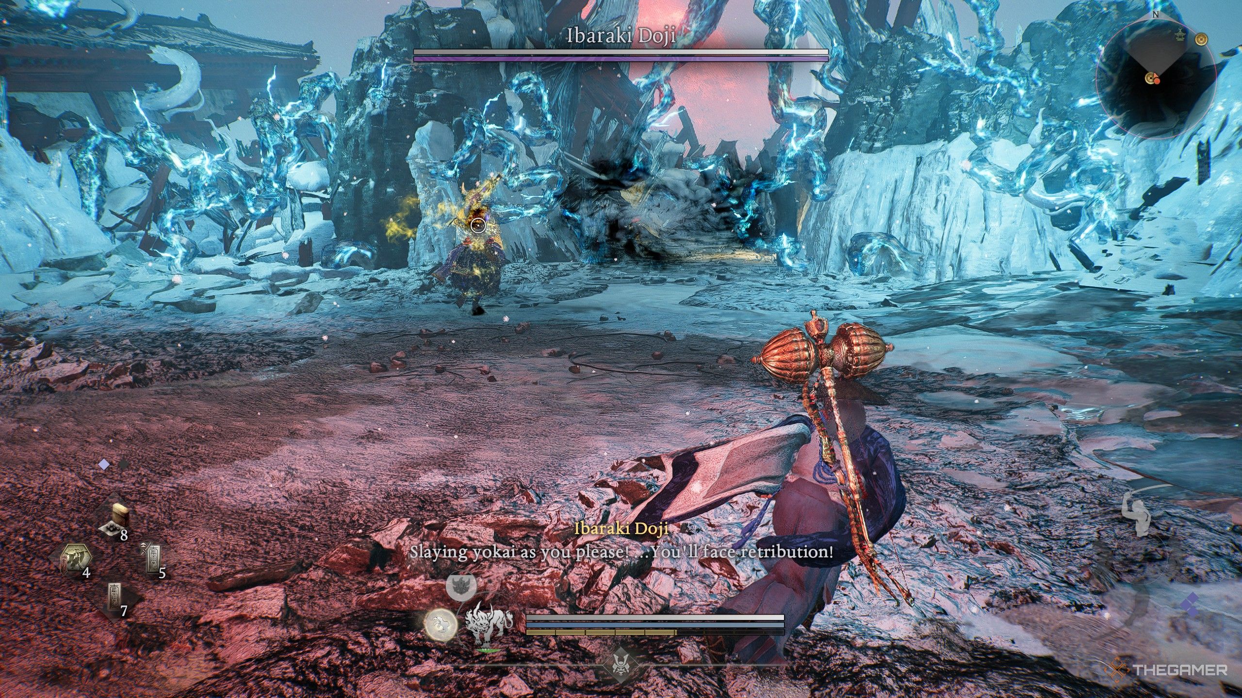 Будьте осторожны с атакой Ибараки Додзи, когда она вращается назад и призывает три электрифицированные руки, чтобы ударить по земле. Если вы находитесь рядом, оставайтесь близко, когда она вращается, чтобы уклониться от рук и атаковать её. Если вы находитесь дальше, просто отступите назад, чтобы избежать результирующих взрывов.