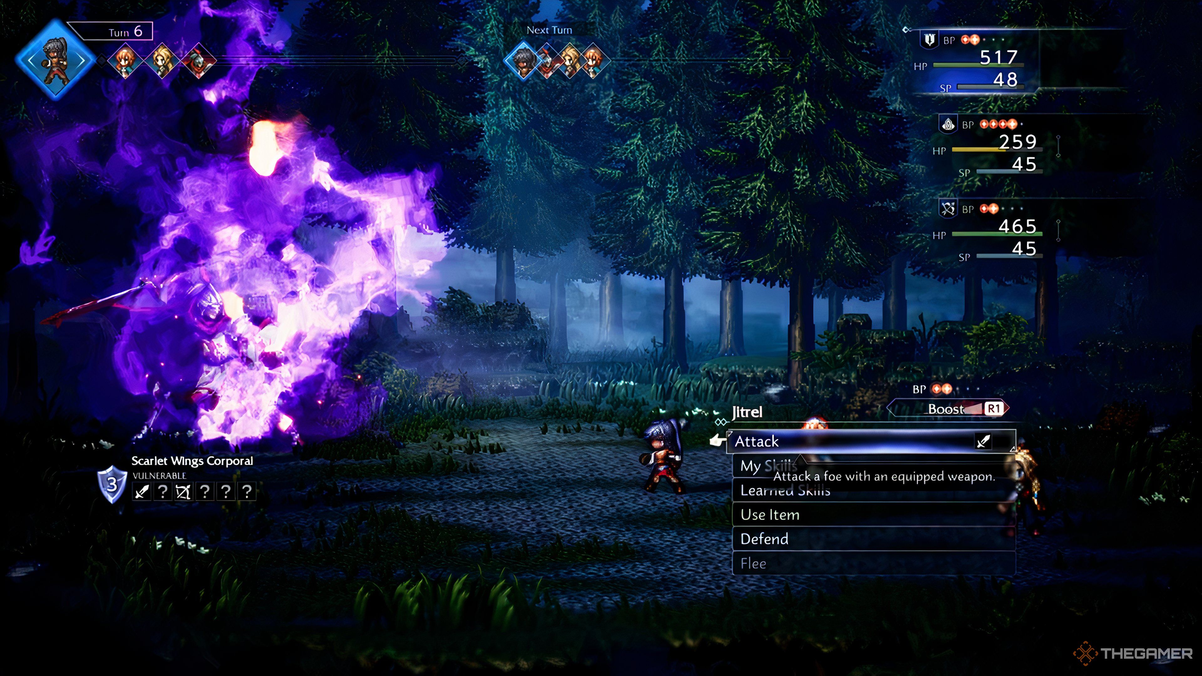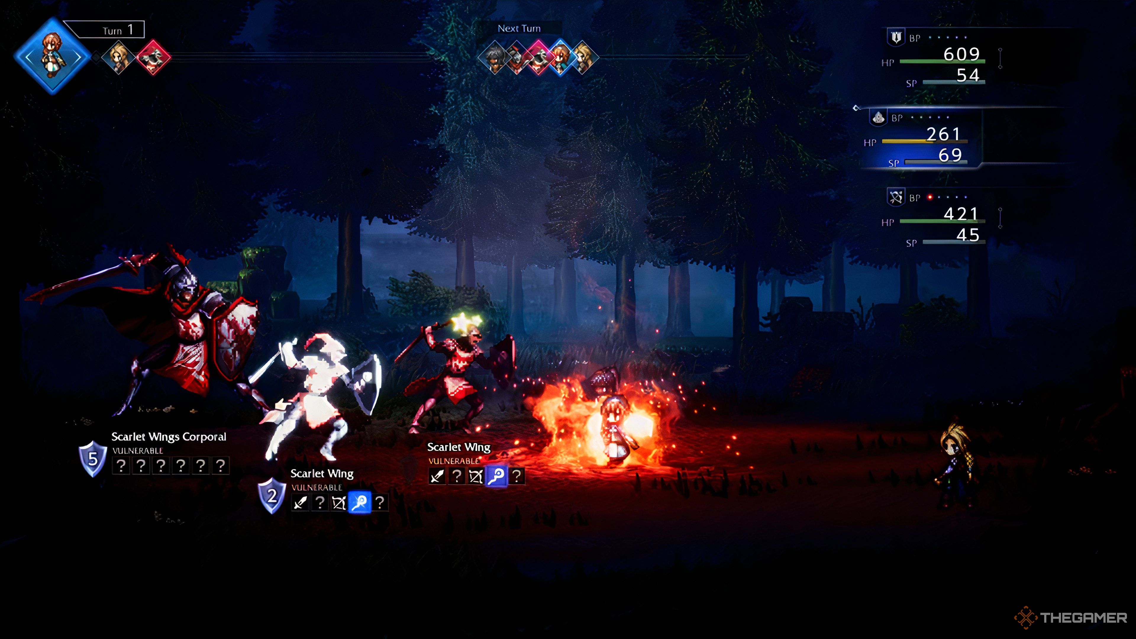Все ваши три члена отряда могут эффективно атаковать уязвимое место Алых Крыльев. Поскольку у них всего две точки щита, вы должны быть в состоянии сломать хотя бы одну из них каждый ход, особенно если вы используете усиление. Они атакуют базовым ударом, но их не очень сложно победить.