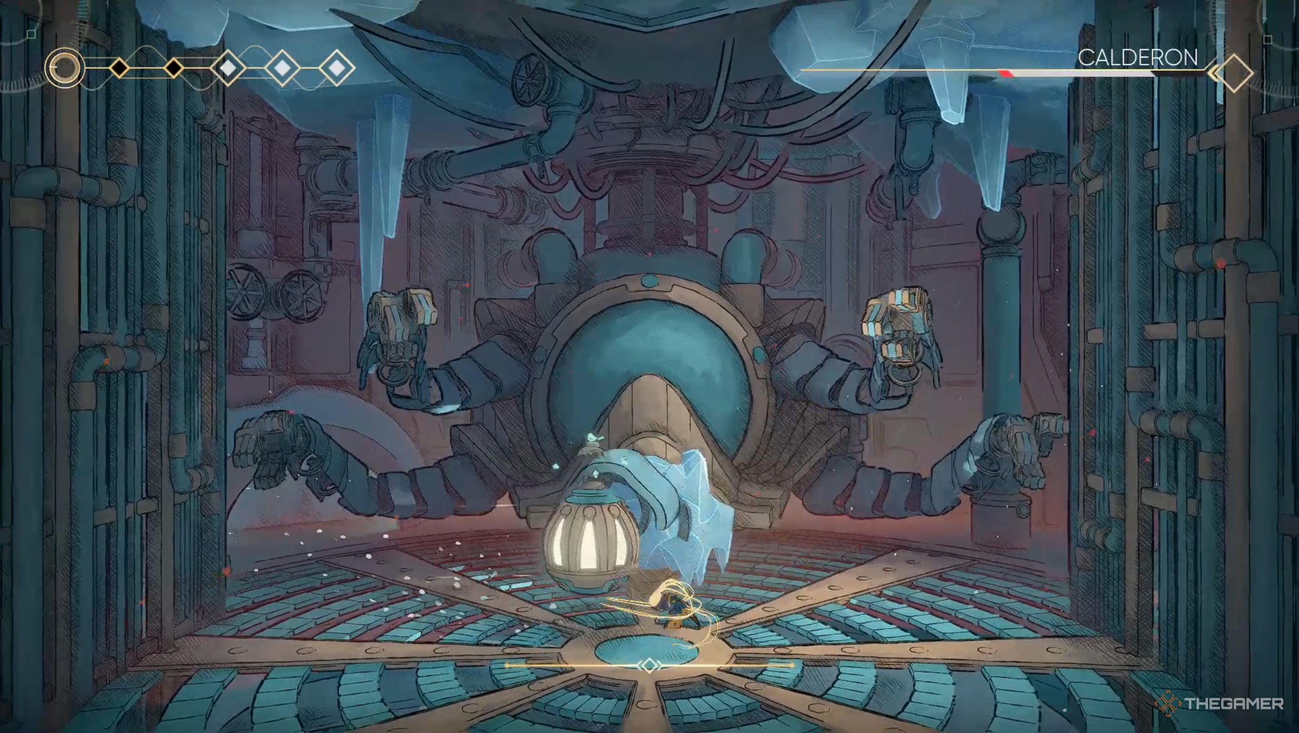 К тому моменту, когда вы столкнётесь с Кальдероном в MIO: Memories In Orbit, игра даёт понять, что основной упор делается на прямые, мощные атаки. Эта битва — значительный сдвиг, бросающий вас на арену, где вам нужно быть полностью сосредоточенным, чтобы уклоняться от неумолимых атак. Кальдерон — это не демонстрация силы; это испытание вашей реакции и внимания.