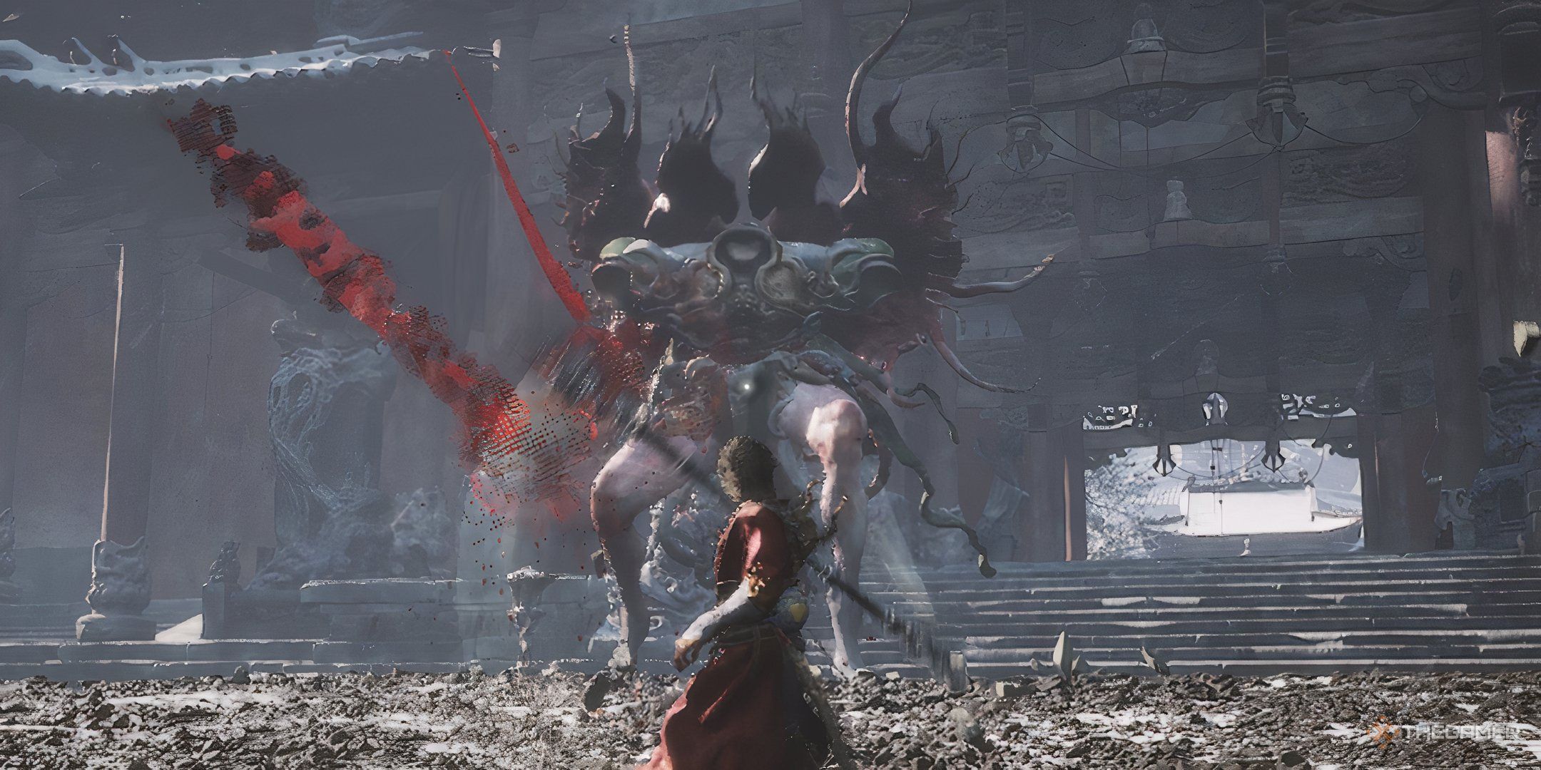 Двигаясь дальше, вы будете идти вперед, пока не увидите узкую тропу, ведущую к величественному храму на горизонте. Приближаясь к храму, вы обнаружите лужу крови и вен, а также оранжевую звездообразную фигуру, напоминающую небесное тело, расположенную сразу за входом в храм.