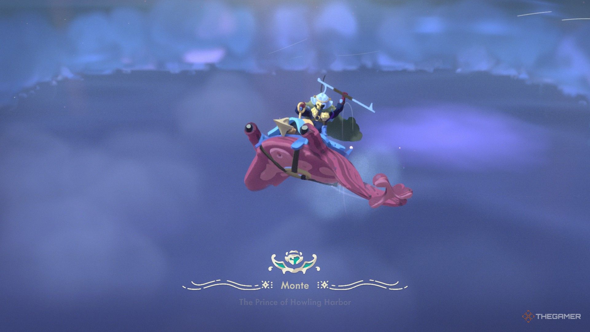 Вы найдете Монте на финише вашей пробежки в Harrowing Heights, второй области, которую вы посетите в Aeolia. Он — воин, едущий на летающей скате.