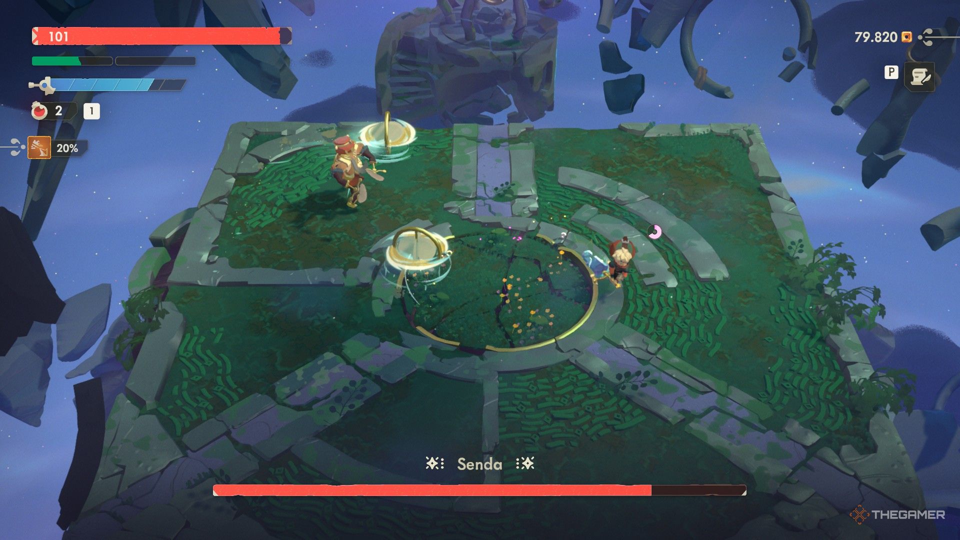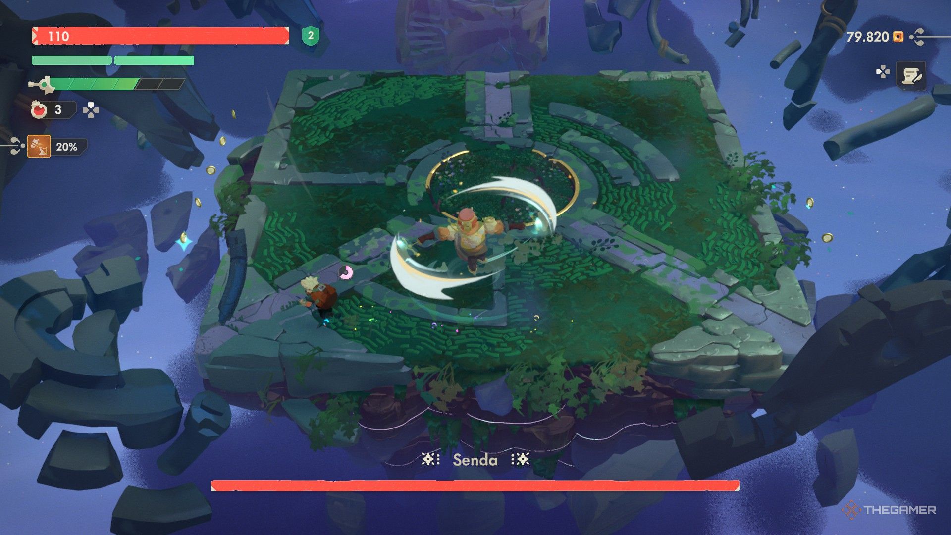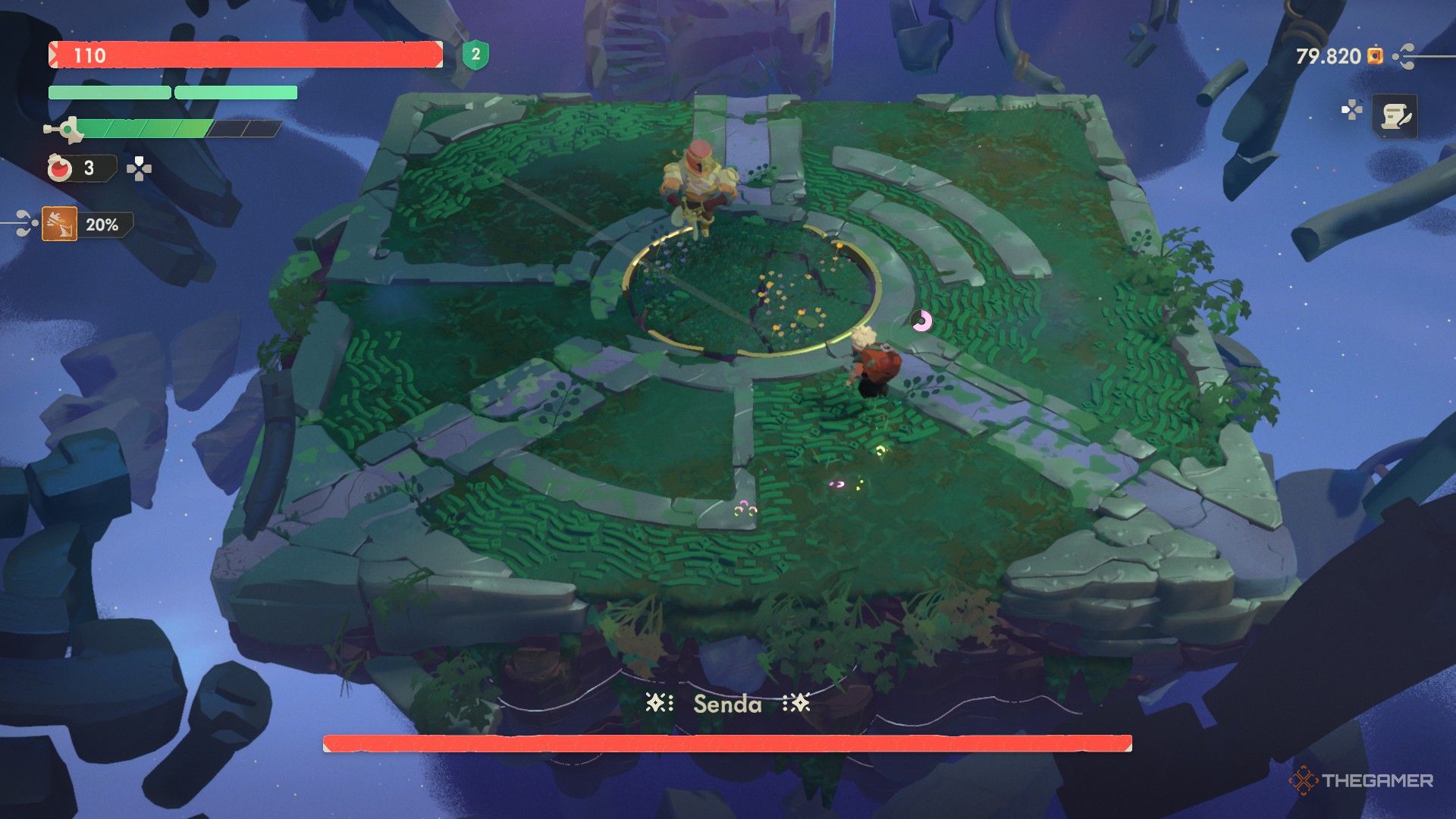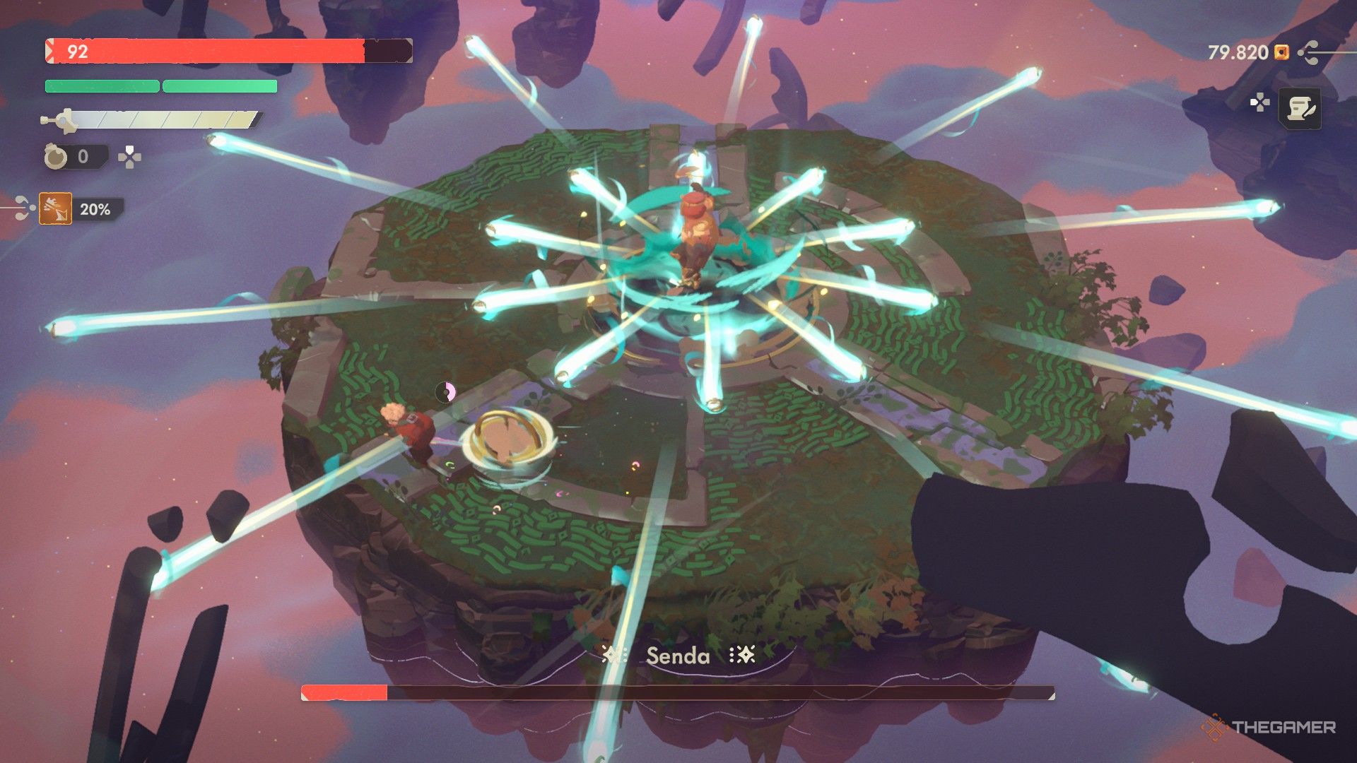 Вам нужно пересечь арену, либо сверху вниз, либо снизу вверх, и уклоняться от входящих атак, перекатываясь. Пока вы держитесь подальше от Сенды, вы будете в безопасности во время движения. Ваш единственный способ атаковать его в этой области — использовать ваше оружие.