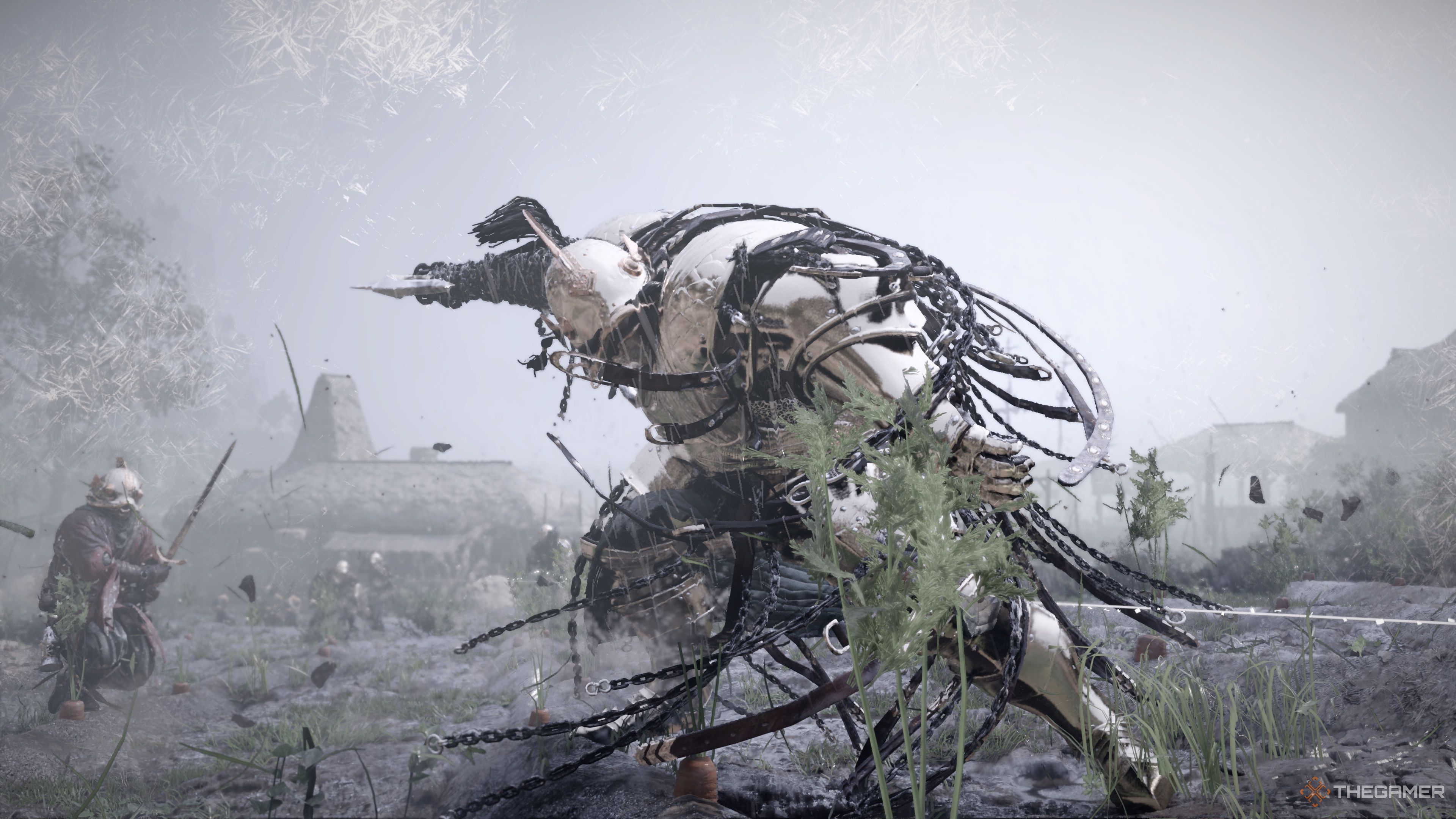 Уменьшите количество врагов, затем сосредоточьтесь на уклонении от атак сэра Сома. После этого используйте Вращающийся Рубящий Удар (R1/RB + R2/RT), чтобы нанести значительный урон, как его здоровью, так и нарушить его равновесие.