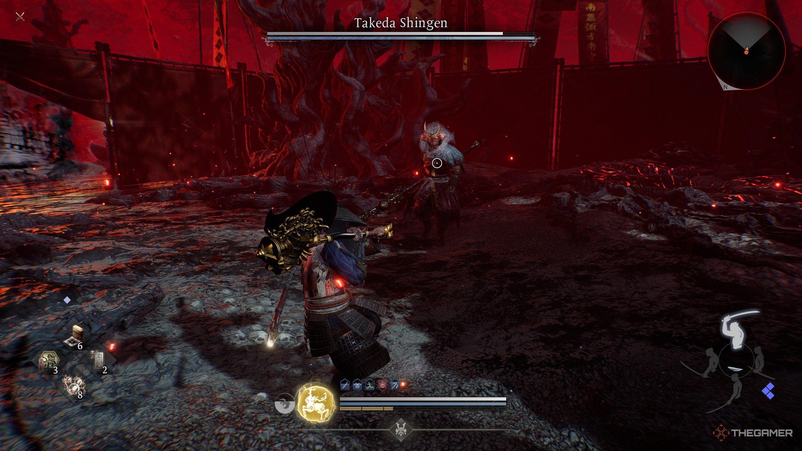 Несмотря на то, что Такэда Шинген появляется относительно поздно в первой части игры, он не является особо сложным боссом. Многие из его атак представляют собой стандартные комбинации оружия с использованием его нагинаты, что создает хорошие возможности для контратаки. Следовательно, лучшая стратегия — играть осторожно и наносить удар, когда он заканчивает серию атак.