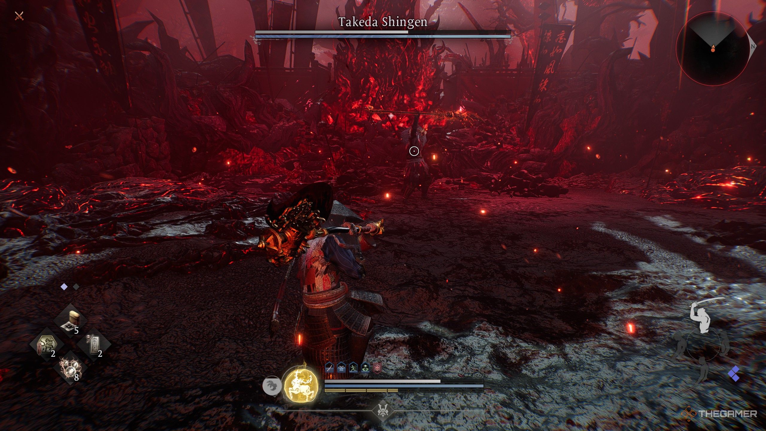 Несмотря на то, что Такэда Шинген появляется относительно поздно в первой части игры, он не является особо сложным боссом. Многие из его атак представляют собой стандартные комбинации оружия с использованием его нагинаты, что создает хорошие возможности для контратаки. Следовательно, лучшая стратегия — играть осторожно и наносить удар, когда он заканчивает серию атак.