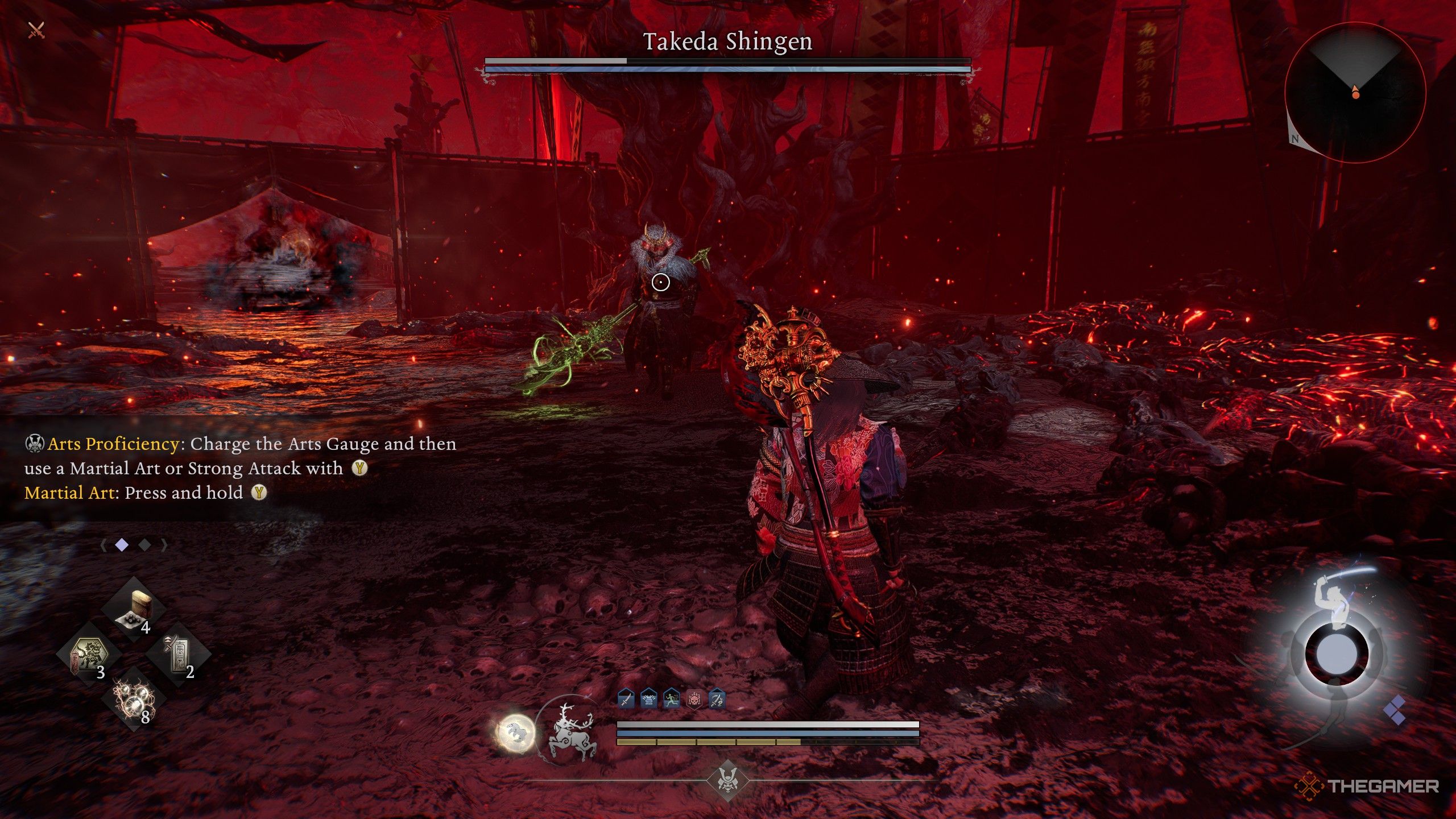 Сохраните свой Живой Артефакт для самого конца боя – он может нанести огромный урон Шингену, пробить его защиту и, возможно, нанести критический удар. Это должно быть достаточно, чтобы победить его, поскольку у Шингена немного здоровья. Если он выживет, будьте особенно осторожны с его мощными атаками.