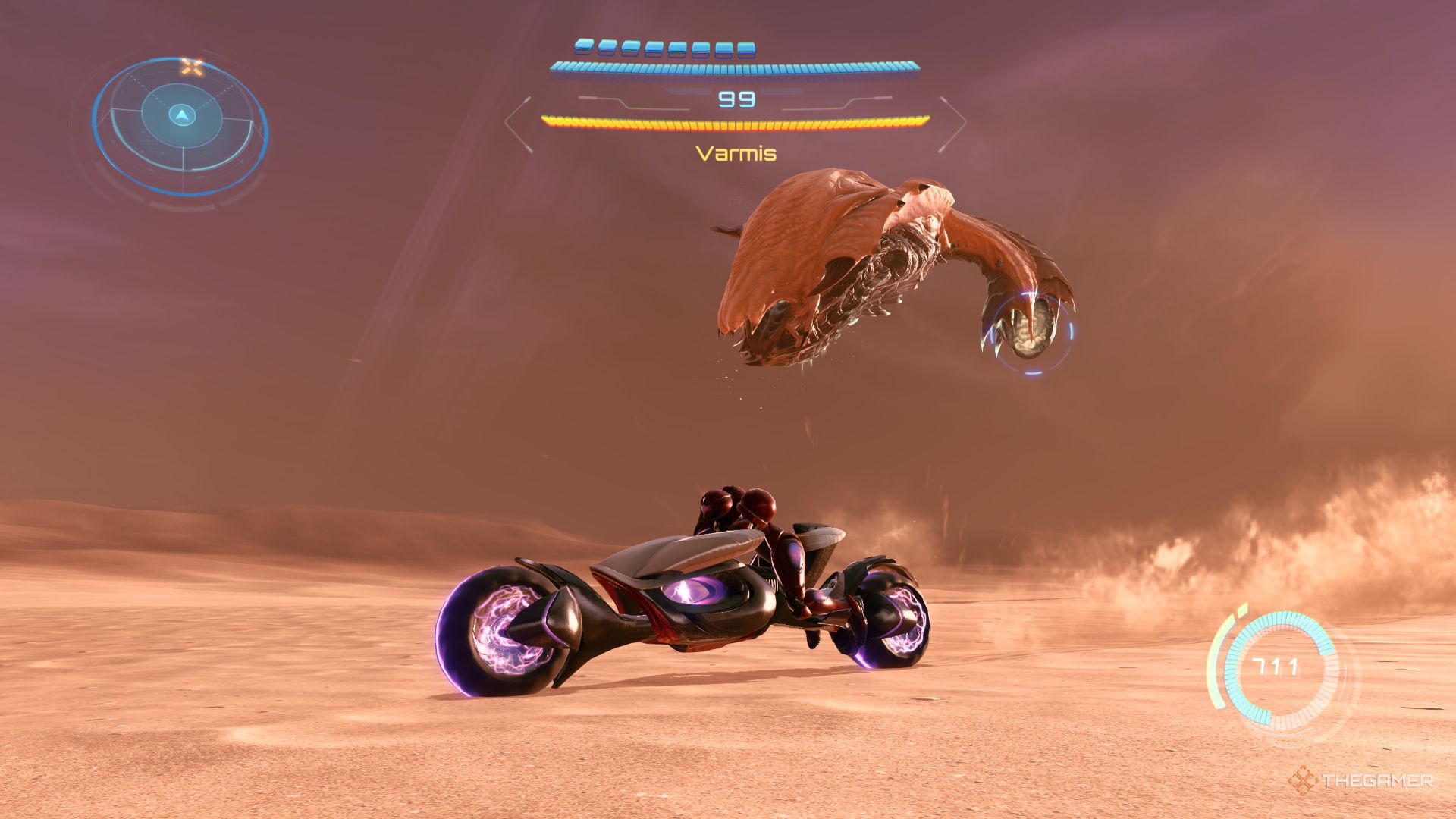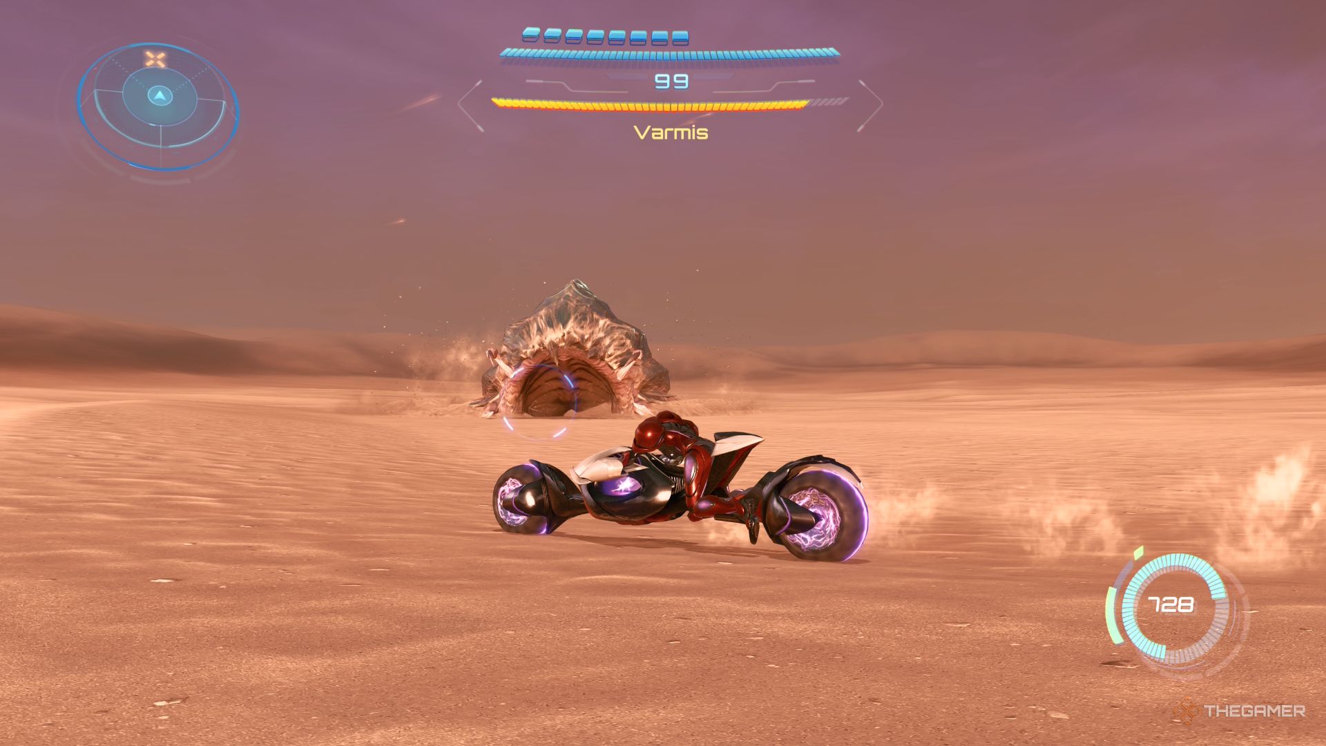 Ключ к победе в этом бою — стрелять из пушки Ви-о-лы по хвосту Вармиса, пока вы преследуете его. Это замедлит Вармиса, позволяя вам сократить дистанцию, а также полностью перезарядит ваш импульс. Если у вас возникают проблемы с попаданием по хвосту, попробуйте несколько раз выстрелить в него, чтобы оглушить Вармиса, что даст вам больше времени на прицеливание перед использованием Power Slide.