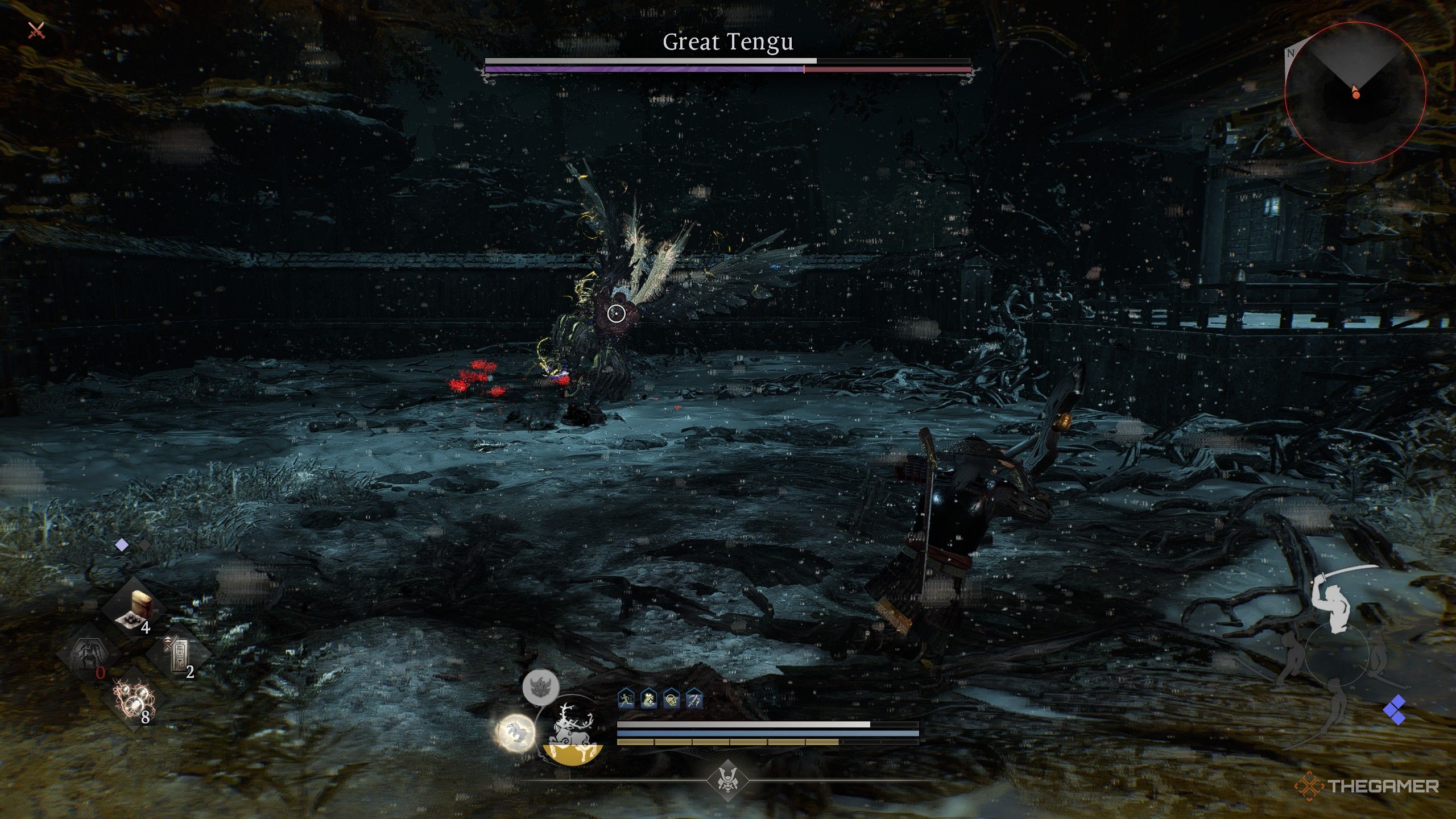 Победа над Великим Тэнгу требует точного времени и большого терпения. Хотя это верно для многих сложных врагов, быстрые движения Великого Тэнгу делают простую погоню за ним неэффективной. Вместо этого вам следует наблюдать за конкретными атаками и использовать короткие паузы, которые у него возникают после их выполнения.