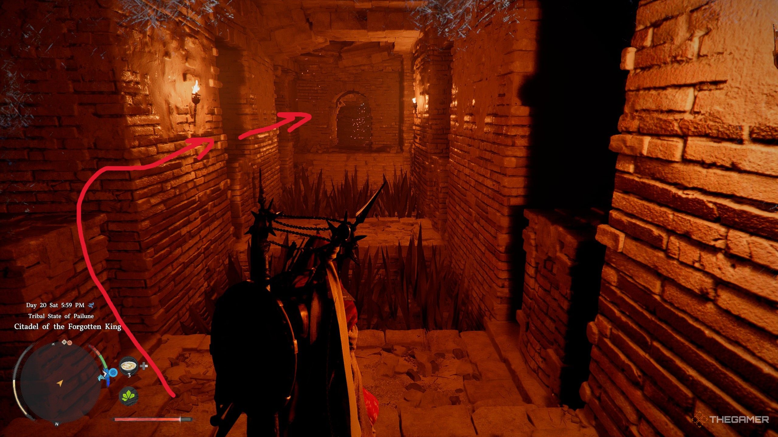 Вы сначала столкнетесь с серией шиповых ловушек. Чтобы пройти мимо них, заберитесь на одну из стен и осторожно двигайтесь вбок над провалом над шипами. Пока у вас достаточно энергии, вы не упадете. Вы также можете безопасно перелезть через факелы, не обжегшись.