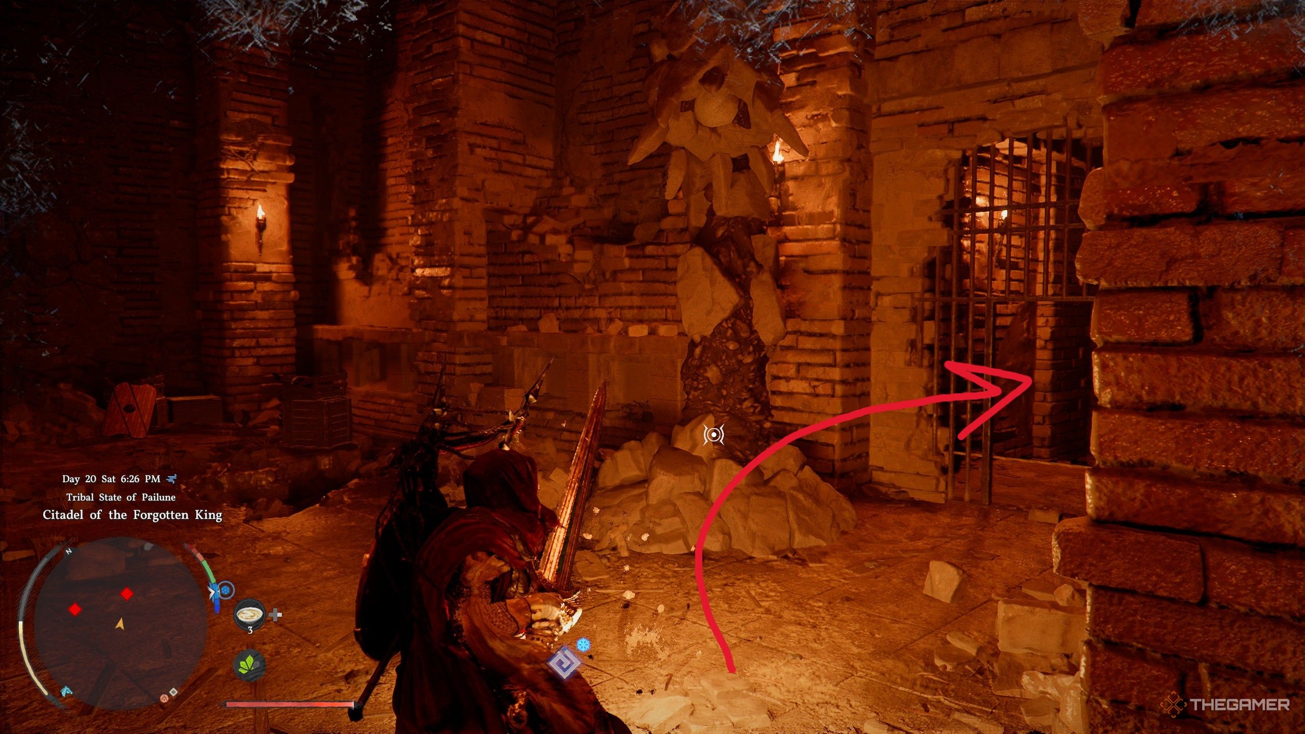 После того, как вы победите всех бандитов, найдите лестницу, ведущую вниз, в замок. Обязательно экипируйте свой фонарь и продвигайтесь осторожно, так как участки потолка слабые и могут обрушиться. Ваш фонарь будет светиться красным в качестве предупреждения перед падением камней, поэтому, если вы увидите это, быстро отступите тем же путем, чтобы избежать удара.