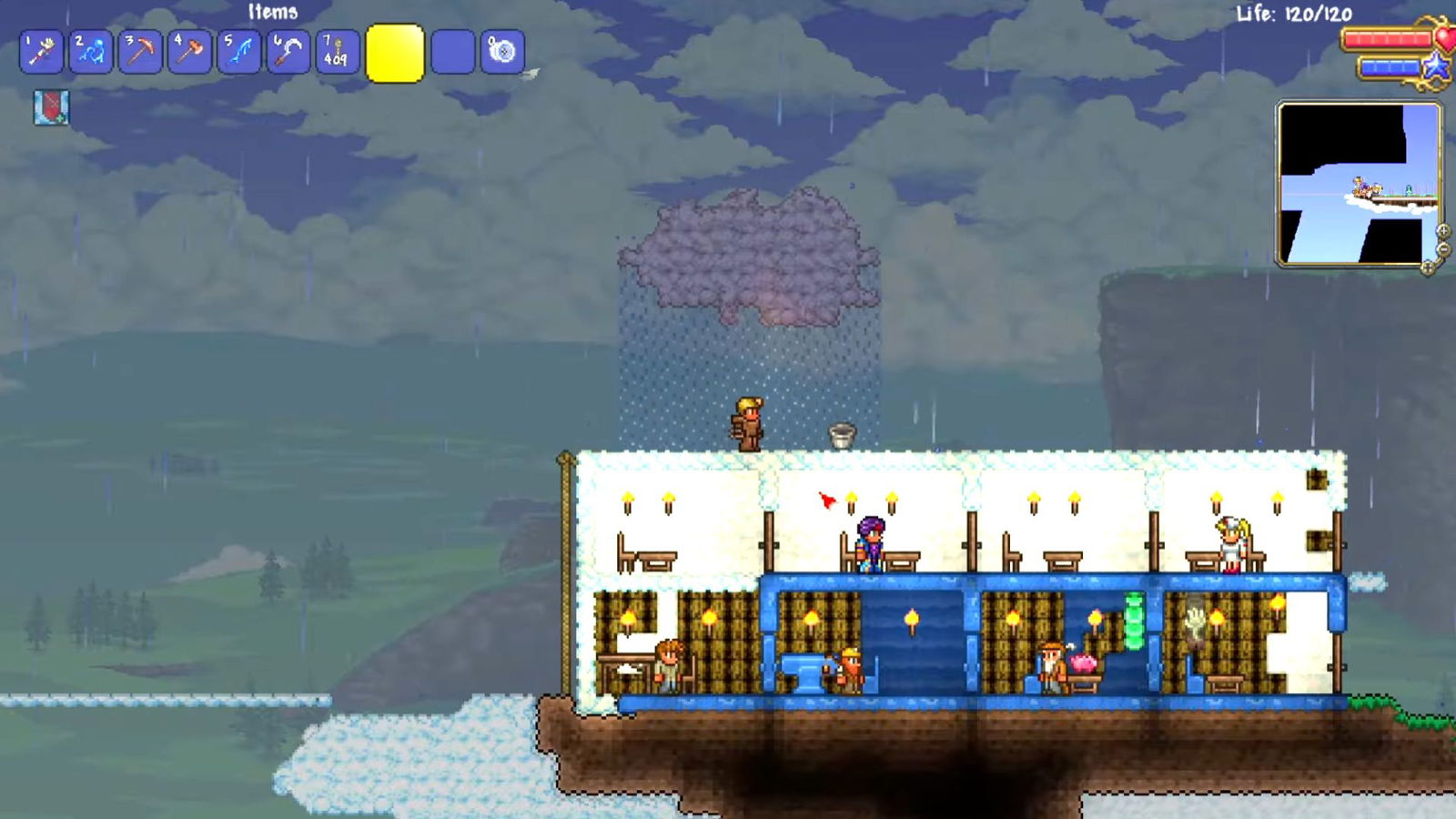 Как только у вас появится ведро в инвентаре, просто дождитесь дождя в мире Skyblock игры Terraria. Дождь выпадает случайным образом из темной тучи где-то на острове. Найдите эту тучу и поместите ведро прямо под нее, чтобы собрать воду.