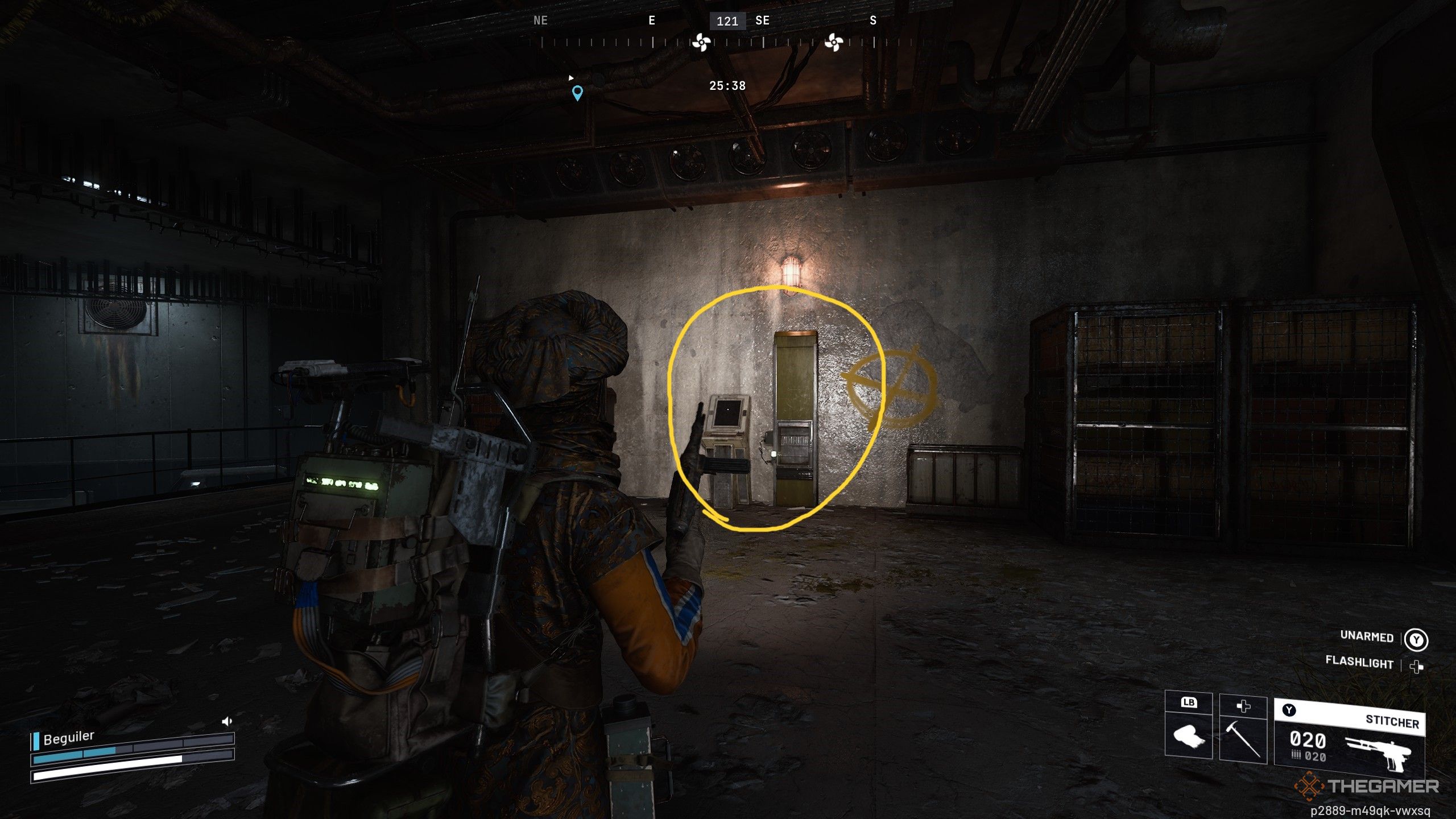 Когда вы увидите жёлтый цвет, найдите граффити на стене и пройдите через дверь справа. Поверните снова направо и спуститесь по лестнице до самого низа. Внизу вы найдёте терминал вдоль стены справа.