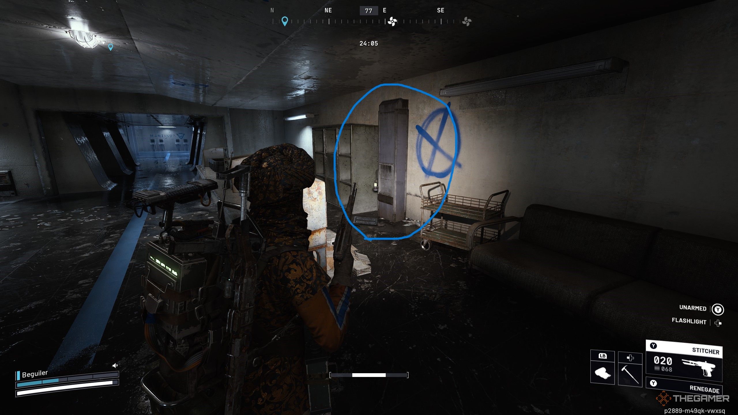 Окей, так что если вы видите синий цвет где-либо, сразу направляйтесь к двери в конце комнаты. Как только вы пройдёте через неё, поверните направо и просто следуйте по синей линии, нарисованной на полу. Она приведёт вас в комнату с большой металлической дверью справа и стойкой слева. Добыча спрятана за этой стойкой, прямо рядом с граффити с синим ‘X’ на нём. Легко и просто!