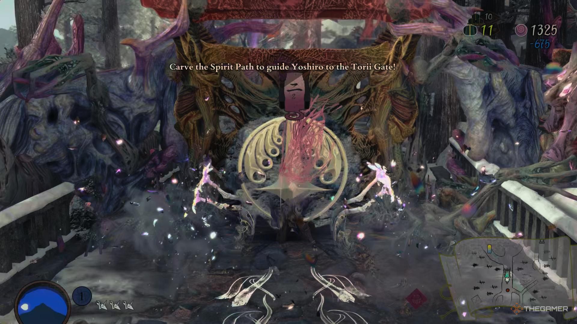 Двигаясь на юг, вы встретите загрязненные ворота Тории, довольно большие и поврежденные, к которым приближается Ёсиро. Продолжайте идти по пути, и в конце концов вы достигнете этого зараженного места.