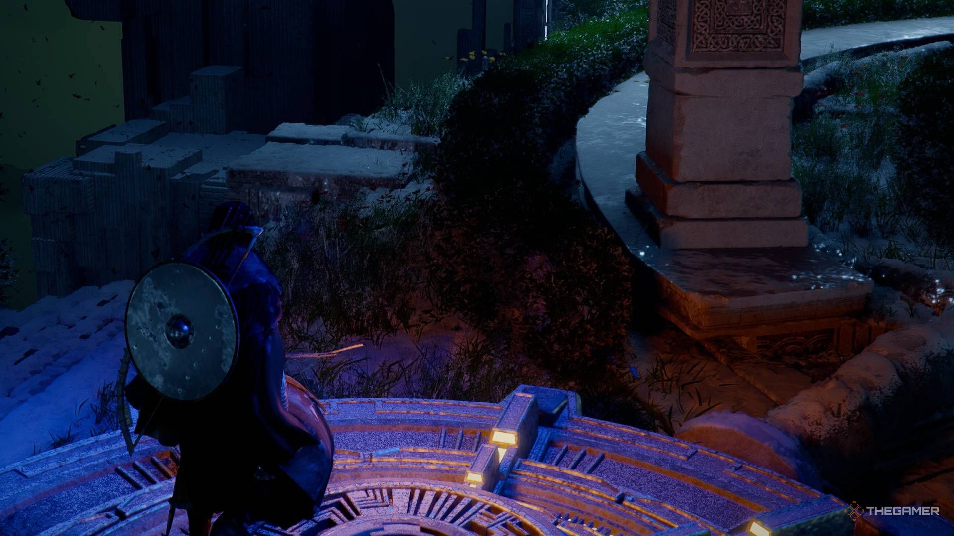 Далее вам нужно будет помочь Октавию включить устройство. Для начала спуститесь вниз. Вы можете найти лестницу справа, если смотрите на головоломку со столбами, как показано на изображении выше.