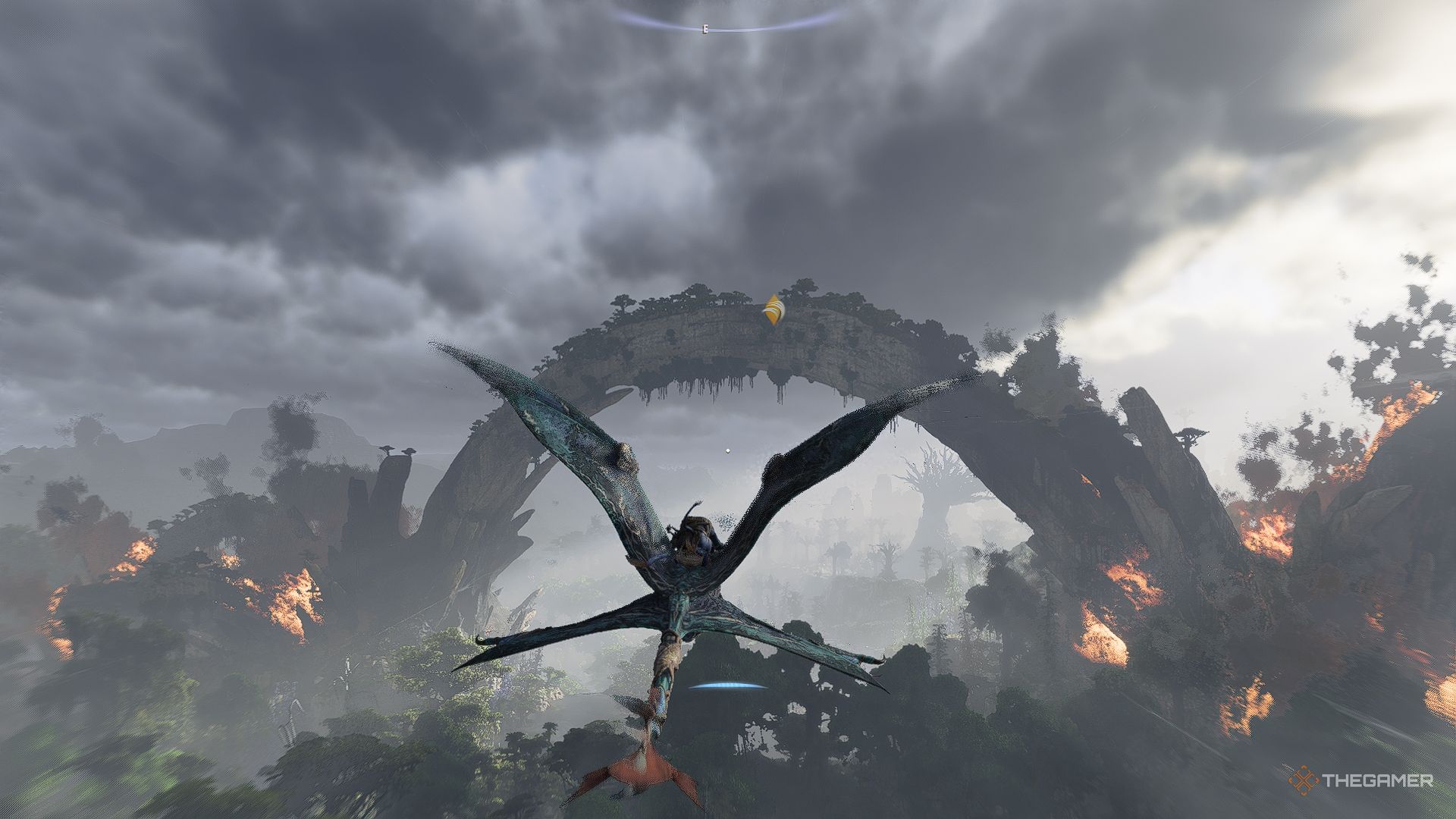 Хорошо, как только начнутся пожары, мне нужно взлететь на востоке от жилища Со’лека на моем икране. Цель — приблизиться к Древу-Дому в Королевском лесу, но очень осторожно — мы не хотим привлечь внимание RDA! Я должен прицелиться в ту каменную арку над Запутанным озером; кажется, это лучший подход.