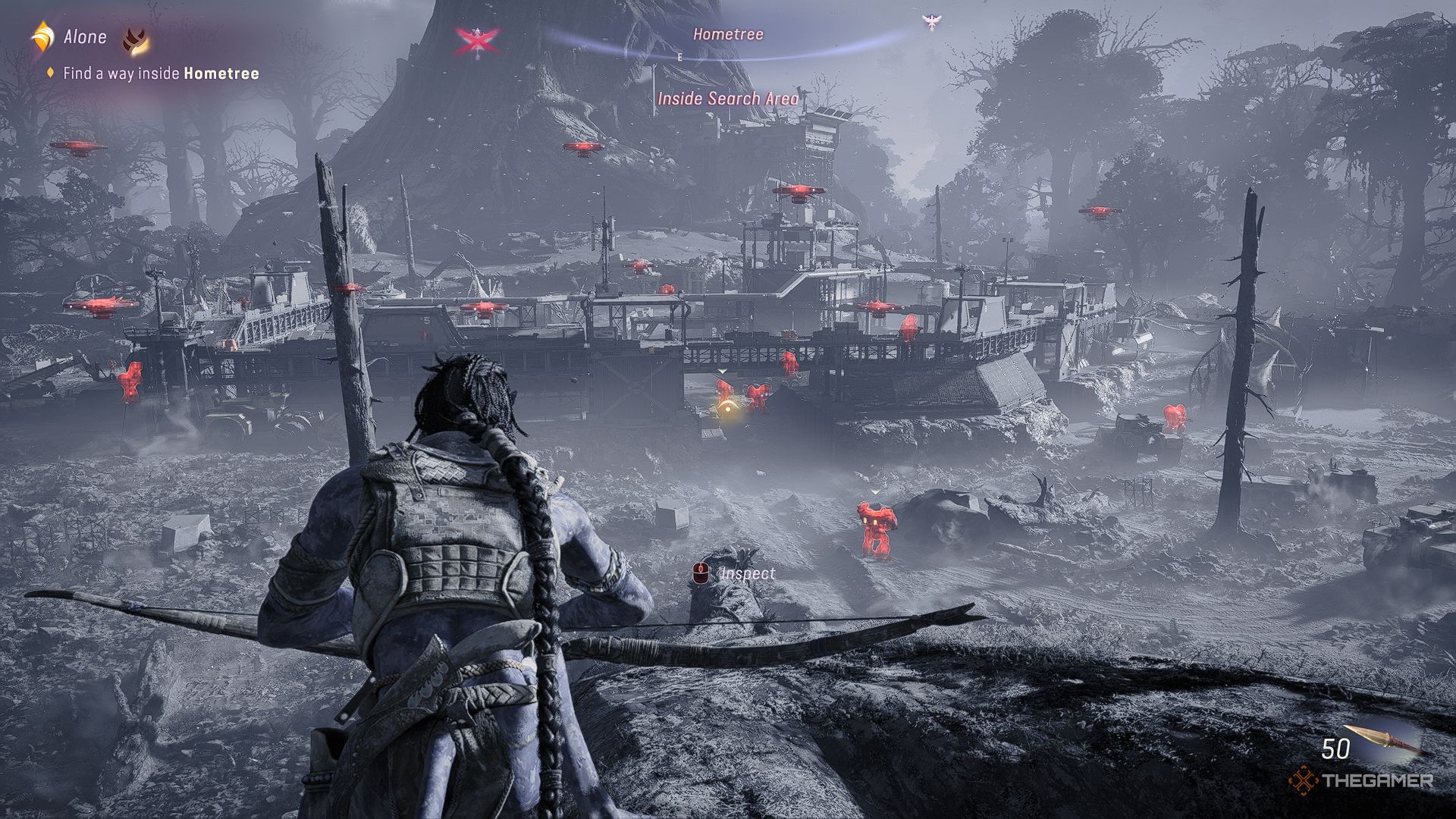 После того, как вы увидите урон издалека, переместитесь ближе к Hunter’s Headland для более четкого обзора. Летите низко, чтобы оставаться незамеченным, затем продолжайте пешком, чтобы достичь входа в Hometree.