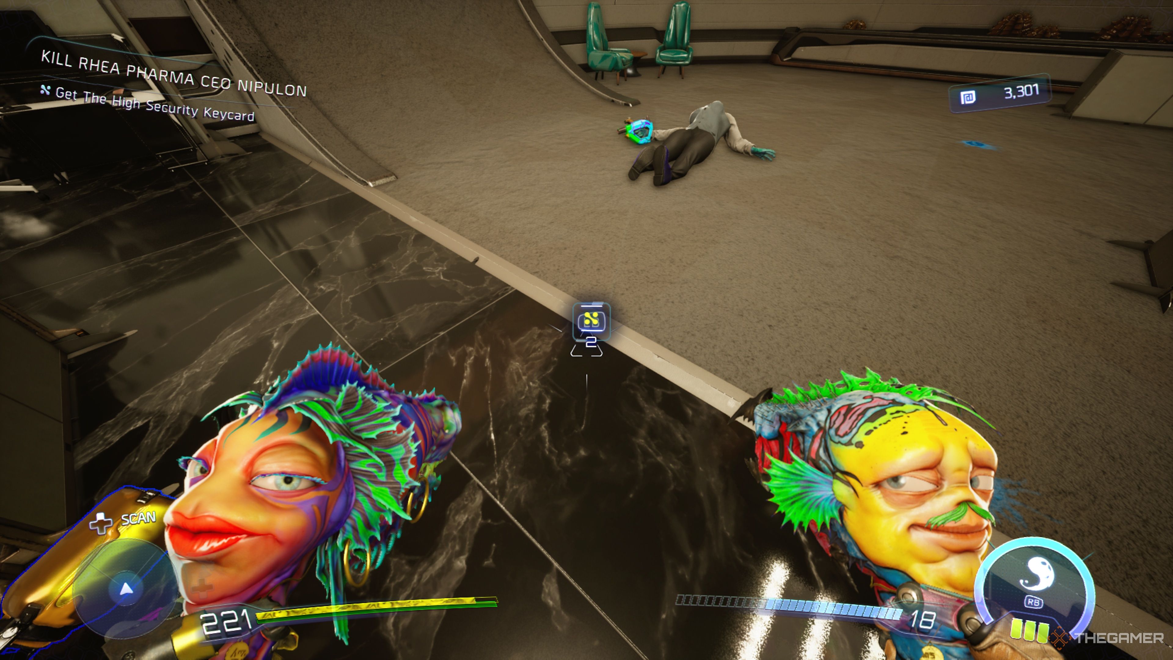 Победите врагов, пока не появится сотрудник Rhea в другой одежде с картой доступа – ваше оружие поможет вам их заметить.