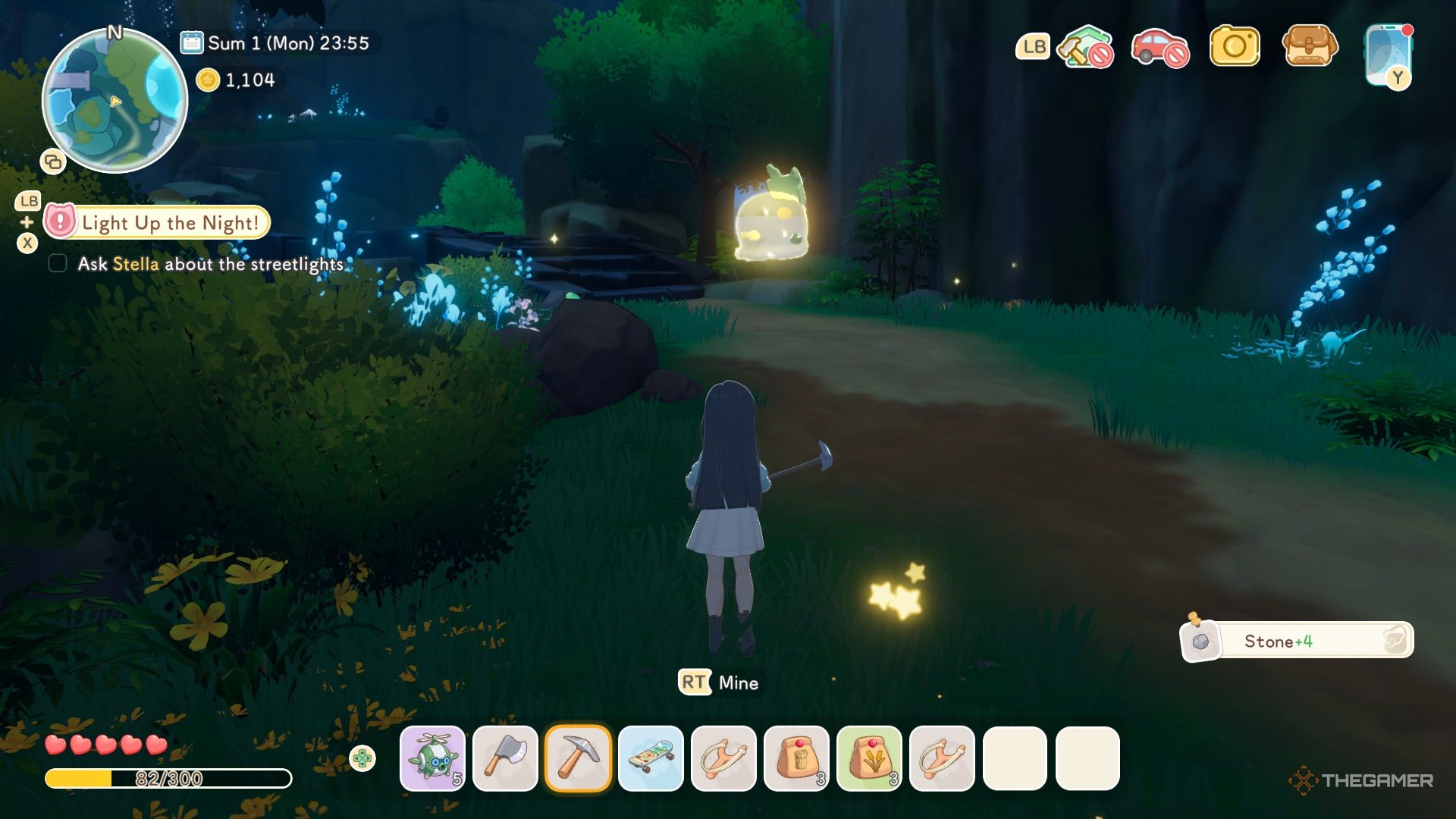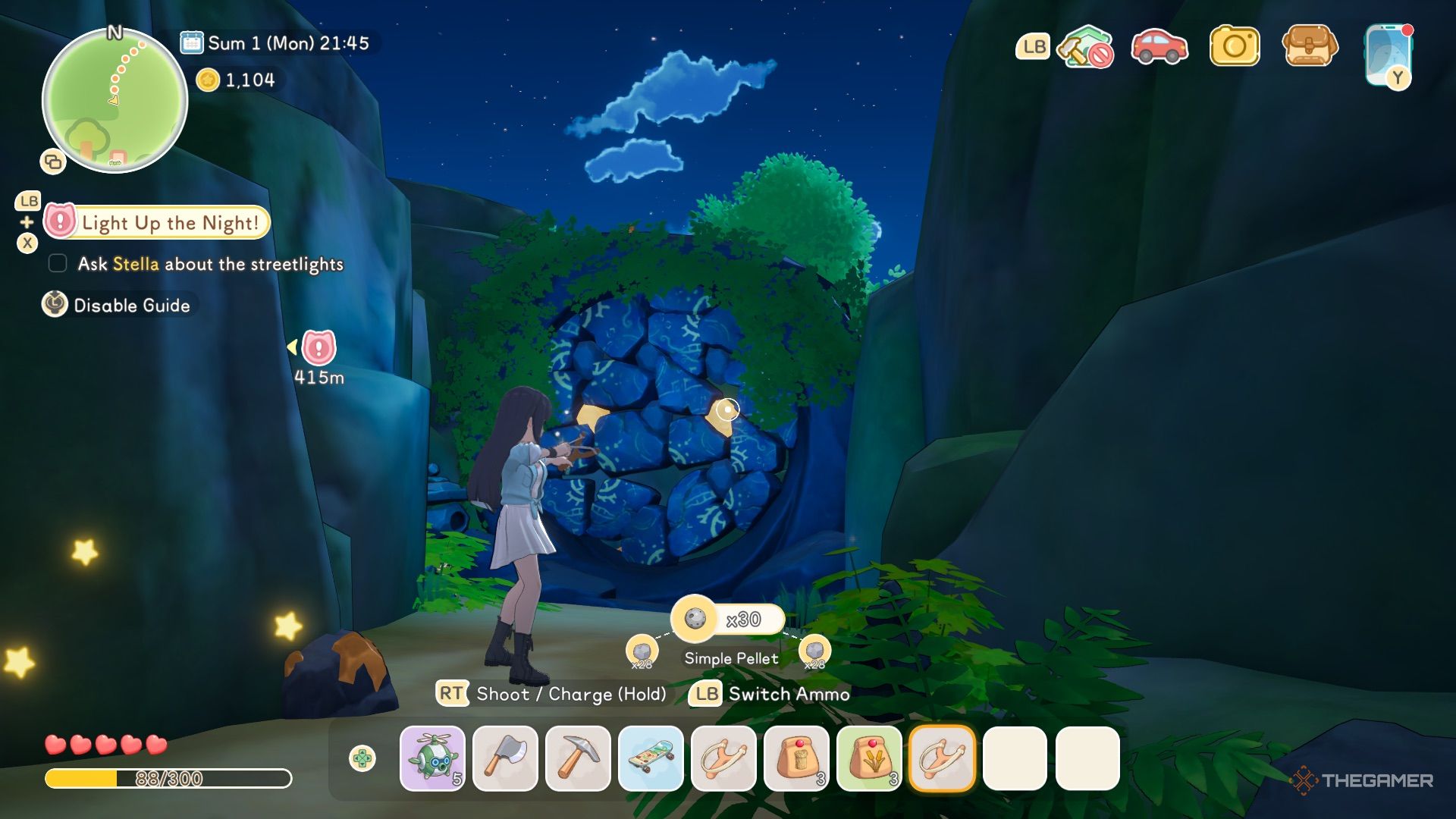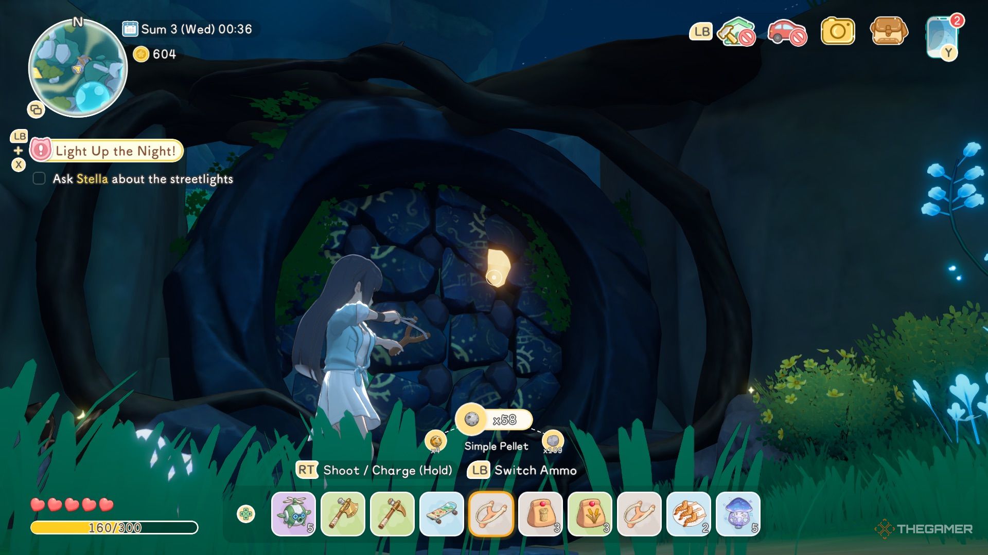 По мере того, как вы поднимаетесь по тропинке от лагеря, вы увидите реку и водопад слева, рядом с которой плавает пузырь. Выстрелите в пузырь рогаткой, а затем откройте сундук, который опустится вниз. Продолжайте подниматься по тропинке и посмотрите под большой, светящийся гриб – вы найдете круг красочных Sleep Lilies. Соберите все лилии, чтобы открыть скрытый сюрприз.