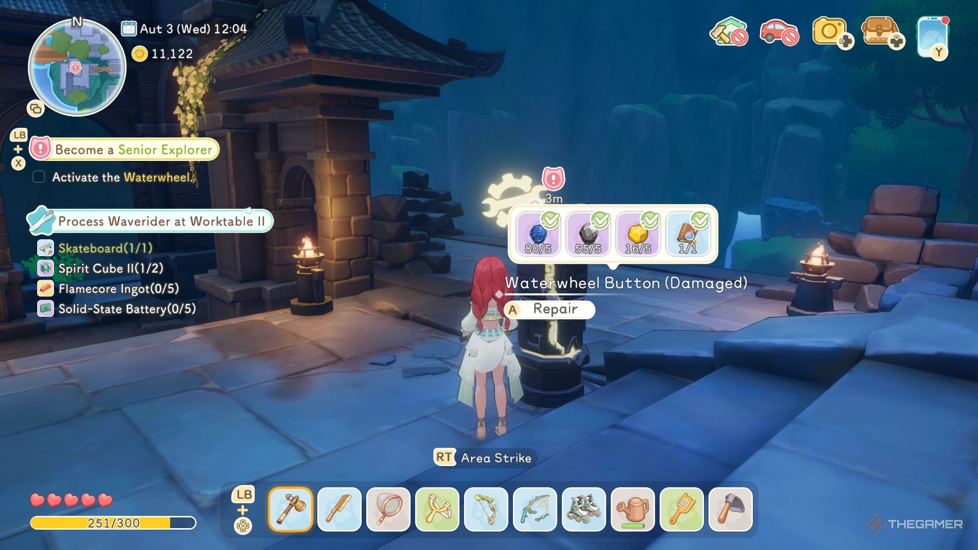 Как только вы освободите его, водяное колесо может быть приведено в действие рудой, которую вы собрали, что позволит вам подняться к Grain Haven или спуститься к Darkwater Shore, который представляет собой небольшой лагерь с рыболовной зоной.