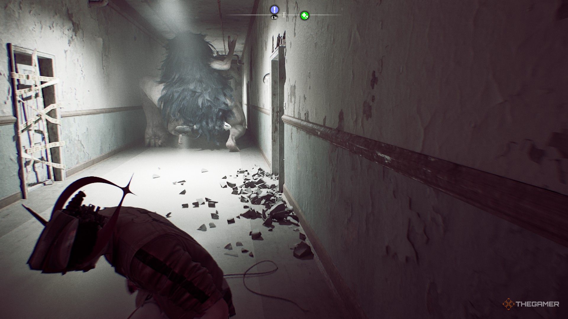 Вернитесь на второй этаж. Первый монстр, с которым вы столкнулись, всё ещё бродит по коридору. Ваша цель – добраться до комнаты рядом с лестницей, по которой вы спустились – вы можете использовать Патологоанатомическую лабораторию, чтобы безопасно наблюдать за монстром. Следуйте за монстром, пока он направляется в Комнату групповой терапии, затем поищите пациента в комнате прямо рядом с ней. Чтобы исправить лицо Розмари, вам нужно одновременно удерживать оба стика вниз.