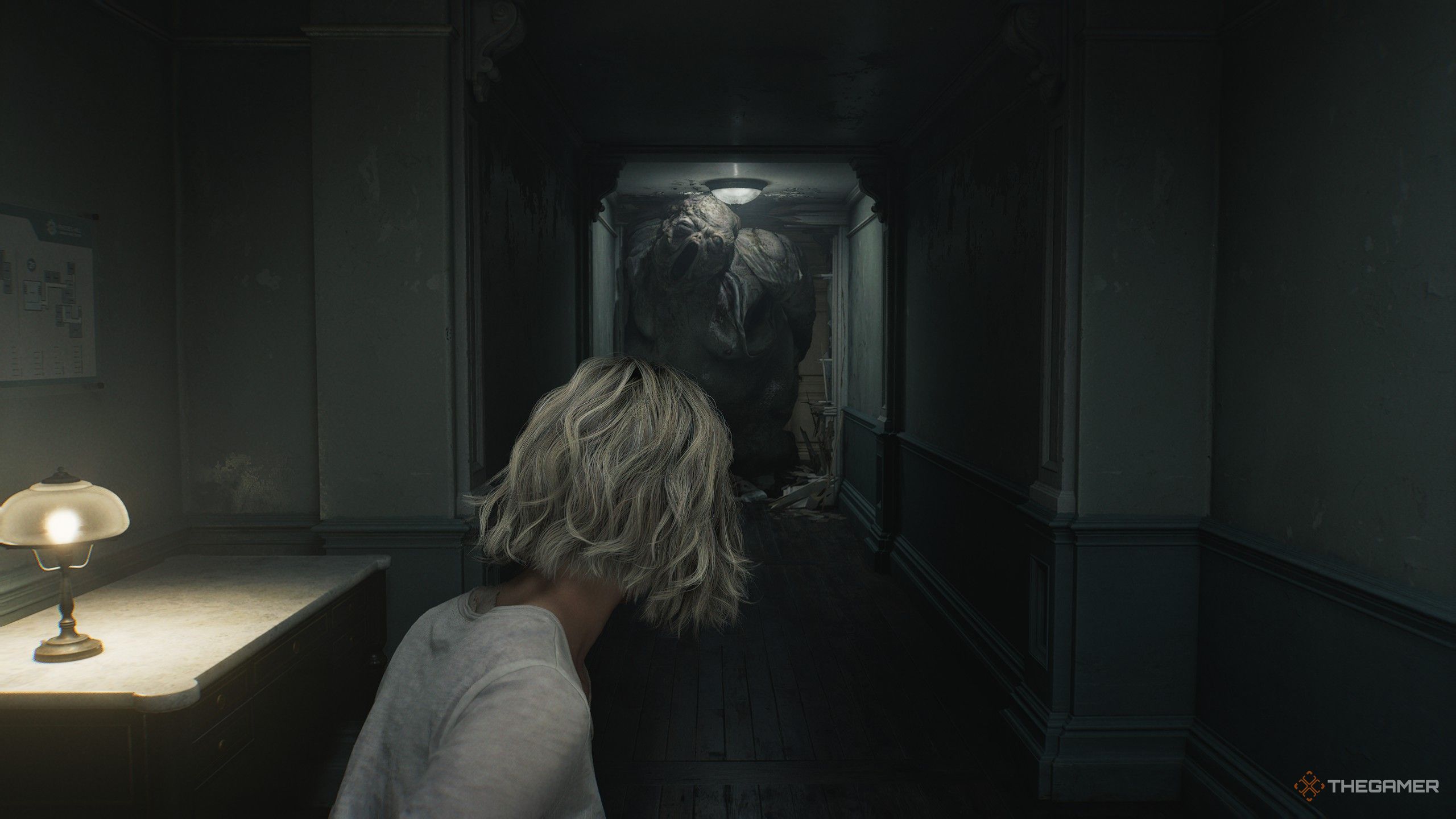 Вы не сможете победить этого существа, поэтому лучший выход — сбежать. К счастью, оно слишком велико, чтобы пролезть в дверные проёмы. Бегите в безопасную комнату справа и дождитесь, пока оно не вернётся по коридору. Когда вы отойдёте на достаточное расстояние, быстро спуститесь по лестнице и войдите в Зал Ожидания.