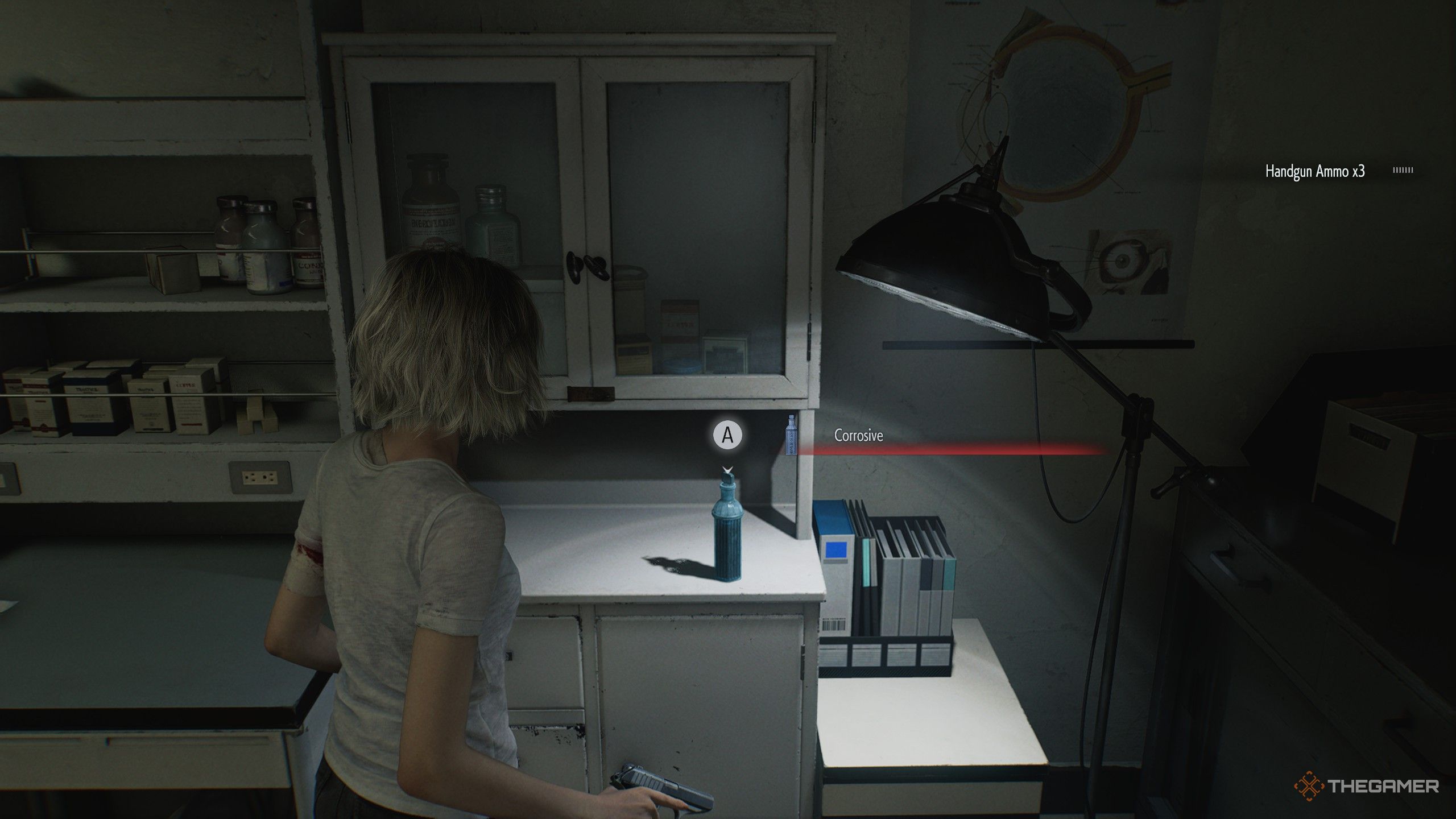 Чтобы открыть головоломку, вам нужно растворить замок, используя бутылку с едкой кислотой. Вы можете найти её в Конференц-зале, который находится сразу за коридором слева от кабинета ведущего исследователя. Будьте осторожны, хотя – как только вы приблизитесь к двери, появится большой, неуклюжий зомби и попытается вас остановить.