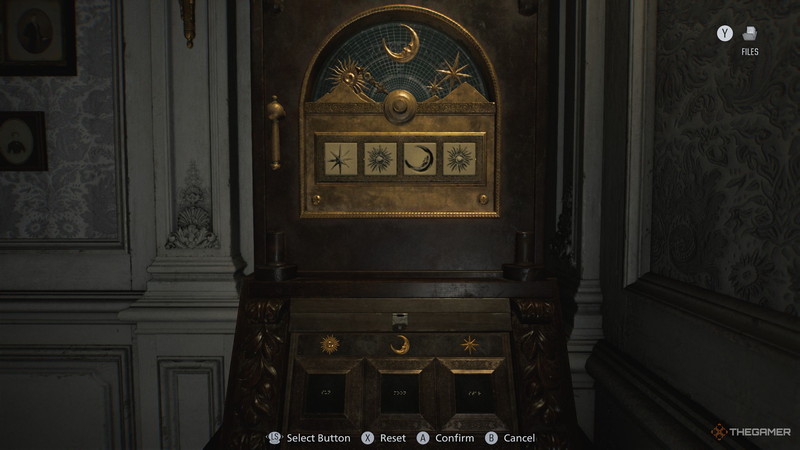 Чтобы найти код, изучите фотографию на столе исследователя – вы увидите головоломку на заднем плане, отображающую последние два символа. Затем проверьте картину на столе вдоль северной стены, чтобы найти первые два символа. Соединение этих символов с обеих фотографий раскрывает полный код: Star, Sun, Moon, Star.