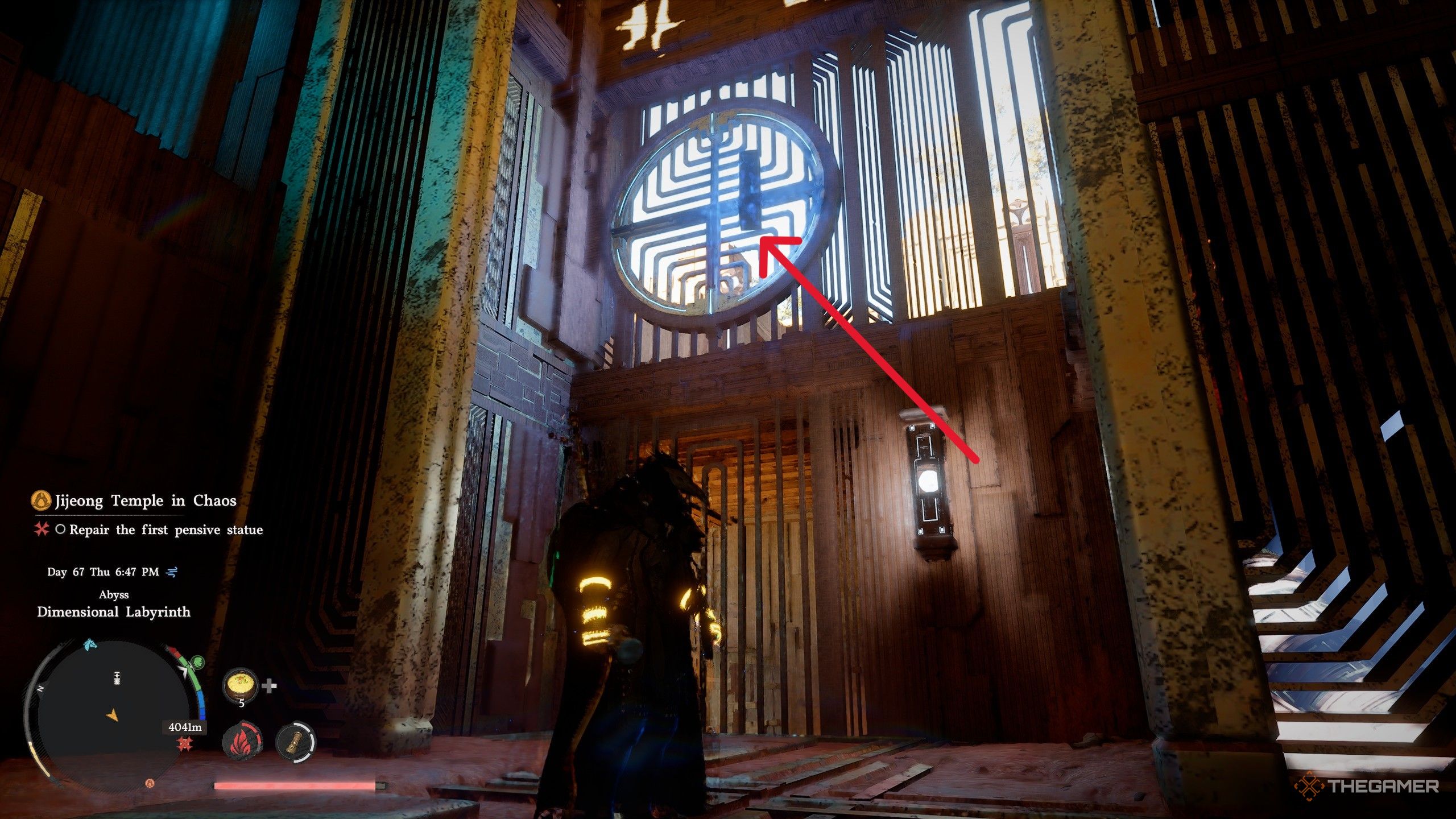 Пролезайте через отверстие в потолке и найдите круглую решётку справа. Удерживайте её и используйте Силовой Удар Ладонью, чтобы раскрутиться в следующую комнату. Как только вы окажетесь там, вы найдёте прямоугольный Ядерный Разлом внизу. Используйте свою Силу Аксиом, чтобы поднять ядро и поместить его рядом с решёткой, через которую вы пришли.