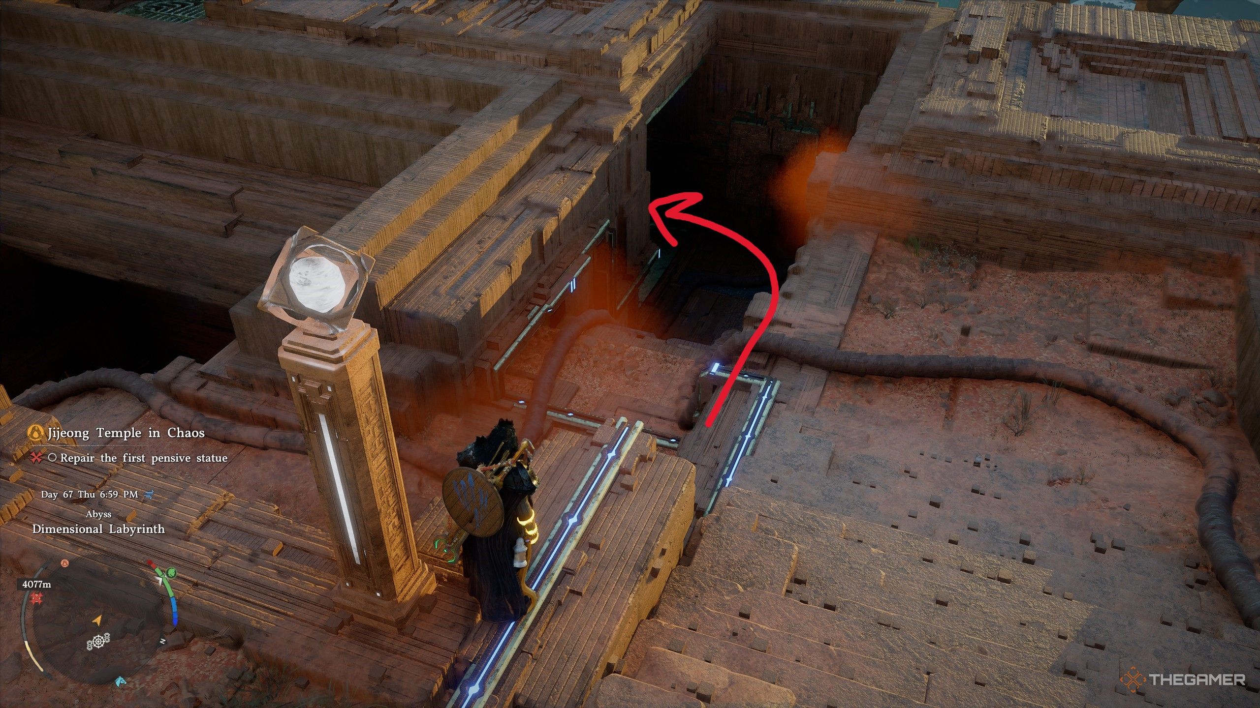 Ваша награда, Артефакт Бездны, находится прямо над переключателем возле высокого алтаря. За ним вы найдёте треугольные ворота. Пробегая сквозь них, вы создадите новую платформу, которую можно активировать с помощью Силы Аксиом, что затем откроет путь к следующему острову.