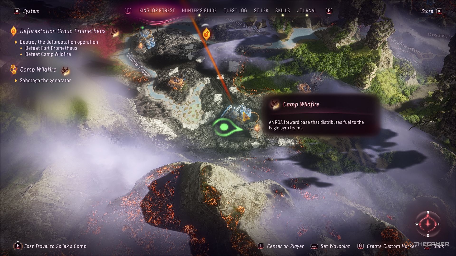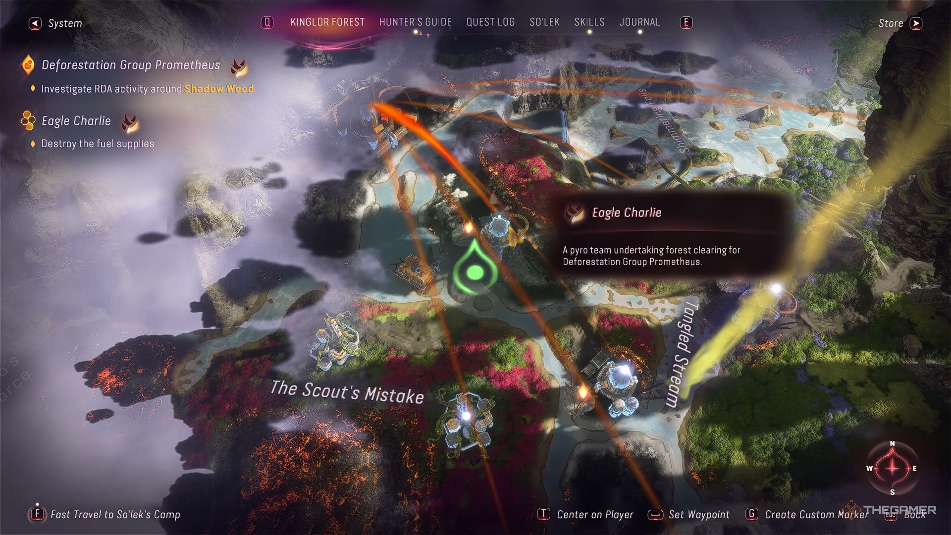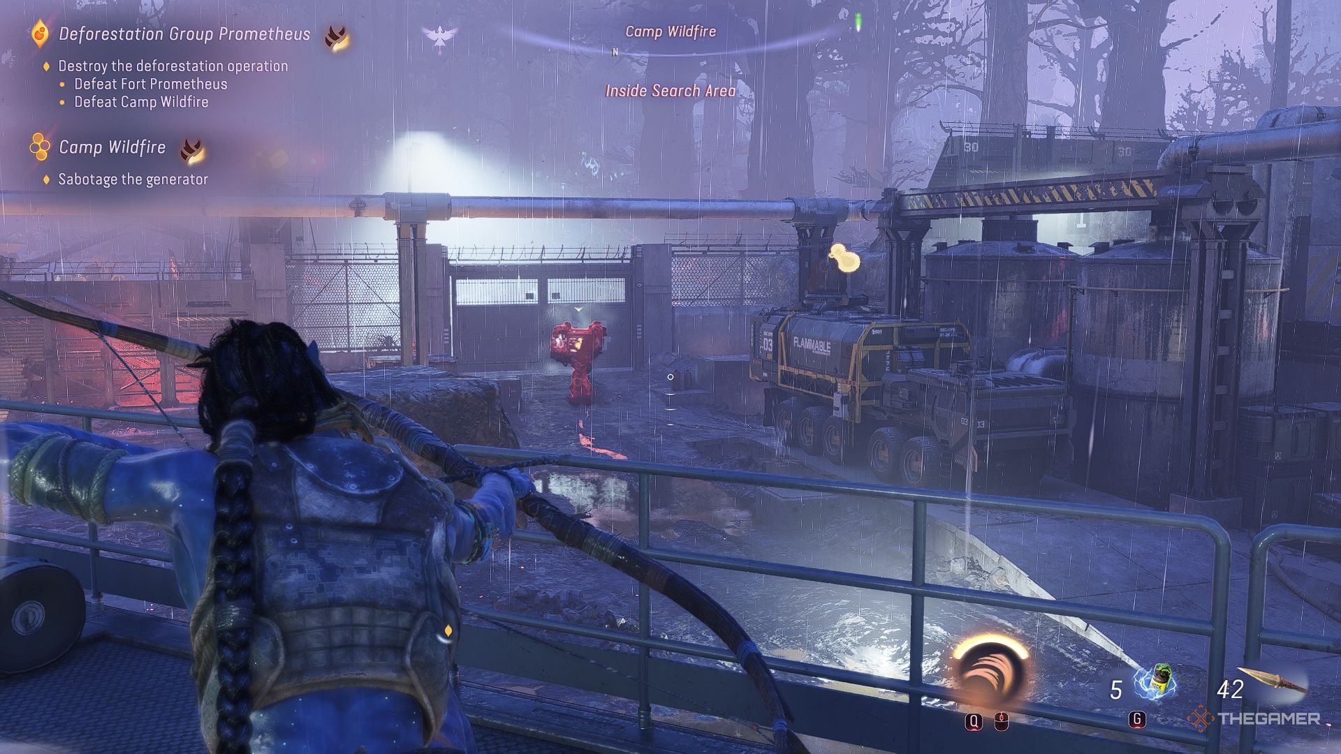 Чтобы победить силы RDA «Прометей», ваша следующая цель — уничтожить лагерь «Дикий огонь». Он расположен к югу от леса Кинглор, на западной стороне, где вы нашли лагеря, и связан с основным фортом «Прометей». Этот аванпост сильно охраняется и укомплектован топливом, что делает его главной целью для саботажа.