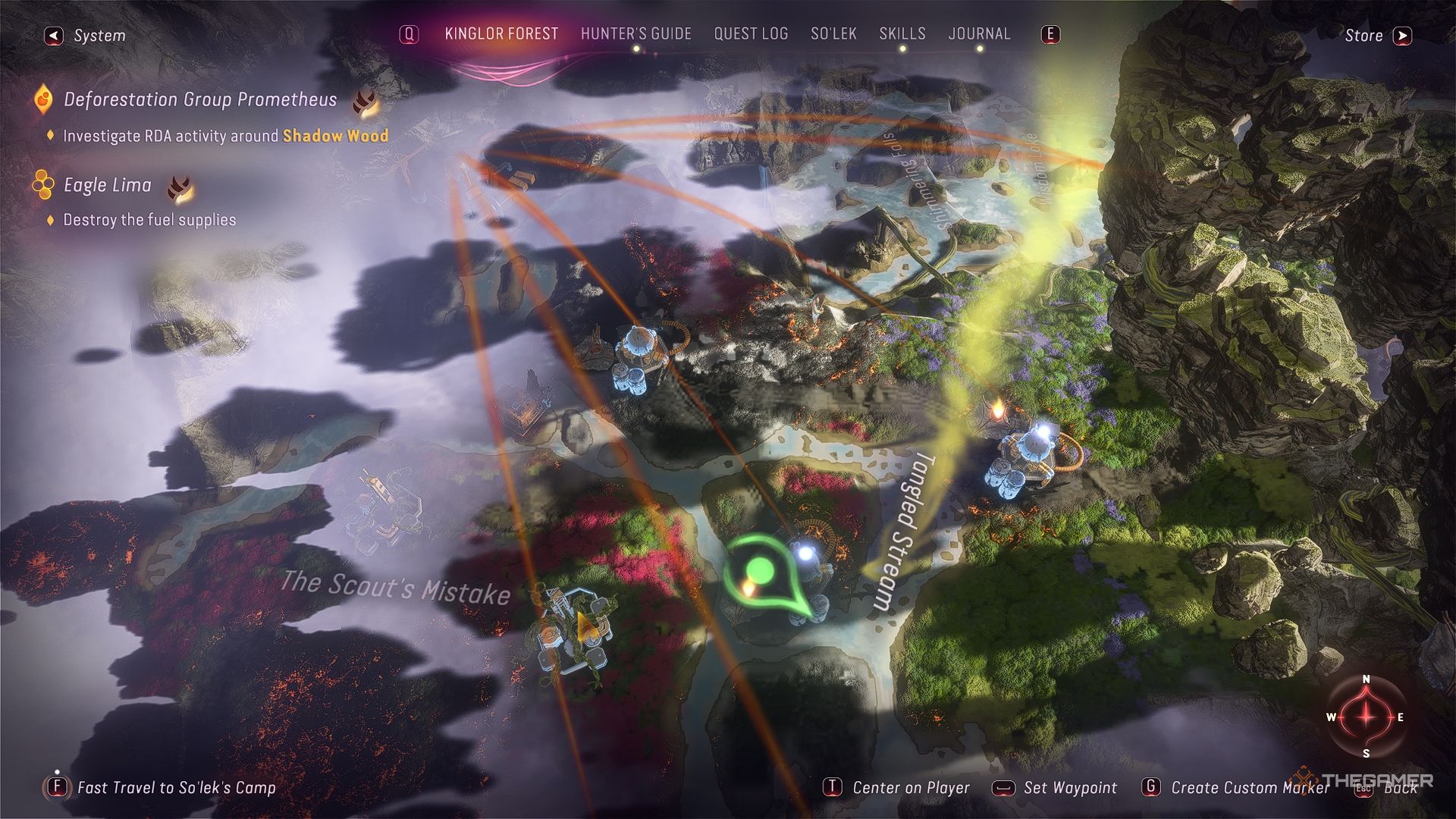 По всему лесу Кинглор, особенно вблизи Тенистых Лесов на западе, вы найдёте несколько лагерей RDA. На карте эти области отображаются как дымные и пепельные. Уничтожение этих лагерей раскроет больше карты и откроет новые локации, в которые вы сможете быстро перемещаться.