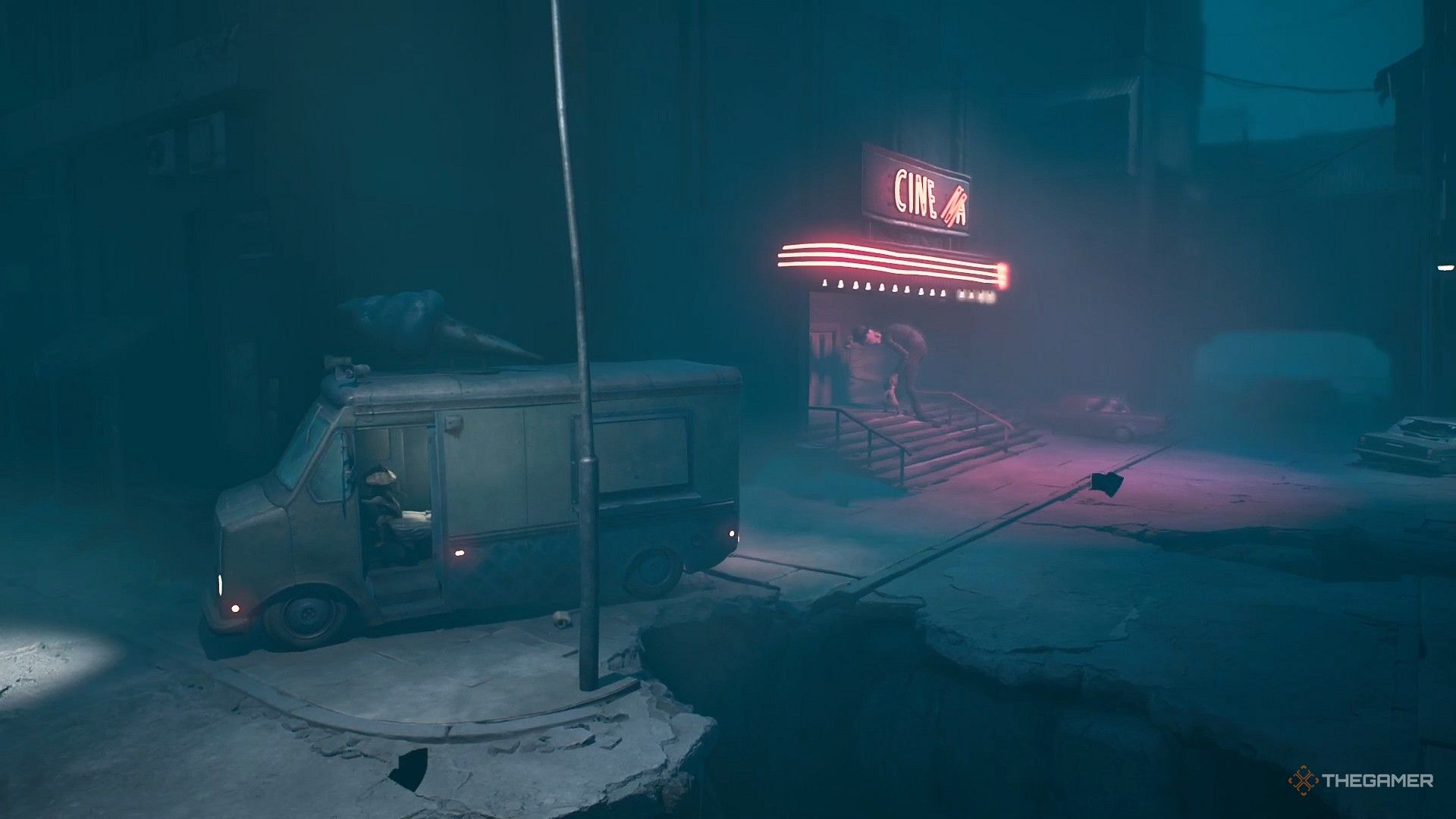 Как только Сниффер войдет в фургон с мороженым, выйдите из него. Он заблокирует путь за вами цепью, не давая вам сразу же следовать за ним. Вместо этого направляйтесь через дорогу от кинотеатра, где вы увидите еще один потрескавшийся участок тротуара. Справа от него вы найдете большой провал в чем-то, ведущий к более узкому отверстию в стене. Проползите через небольшое отверстие, и вы окажетесь на другой стороне трещины.