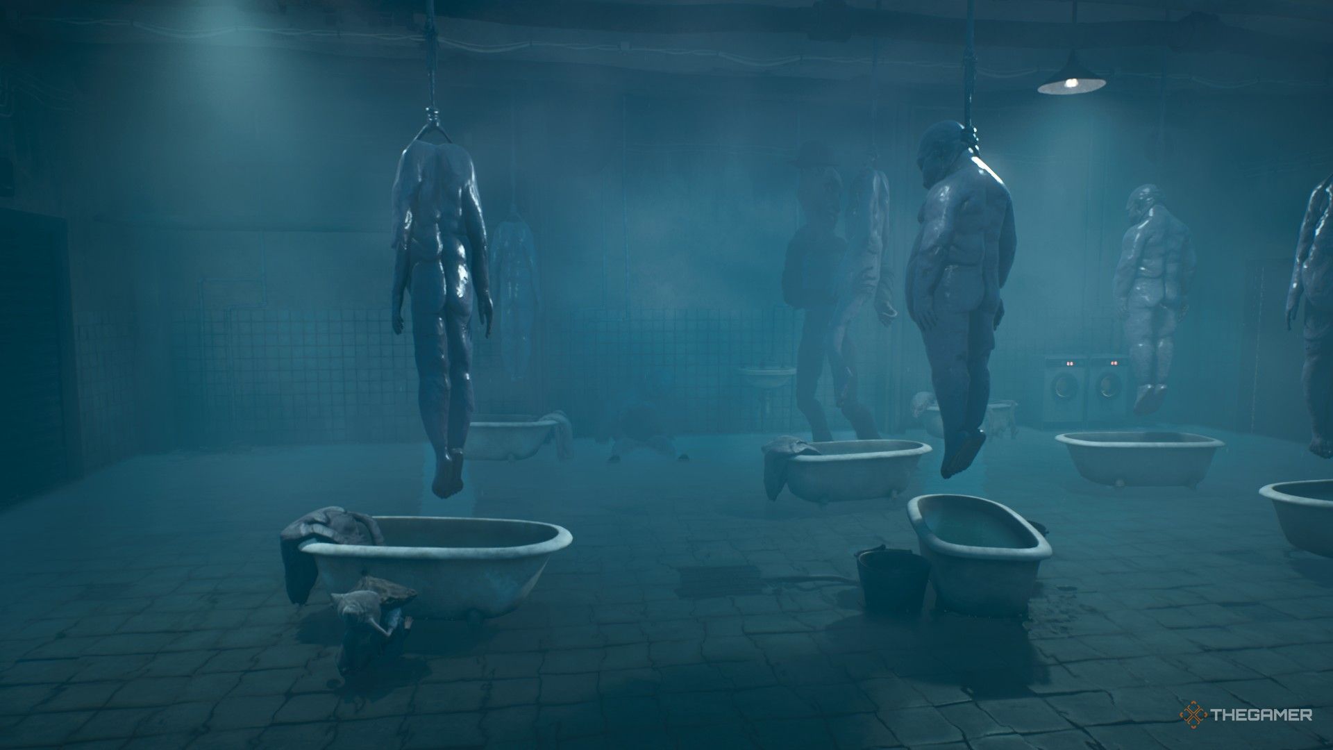 Окей, так я только что вошёл в эту жуткую комнату с телами в ваннах. Ключ здесь – использовать эти ванны в качестве укрытия, когда появится Sniffer. Серьёзно, как только я вошёл, я пригнулся за ванну, расположенную дальше всего на той стороне, откуда я пришёл – там я и оставался, пока Sniffer делал своё дело. Он довольно предсказуем, на самом деле. Он передвигается по заданному шаблону, как и с теми чемоданами на железнодорожной станции. Я могу немного продвинуться вперёд, но он вернётся к той же рутине, поэтому мне нужно правильно рассчитать время.