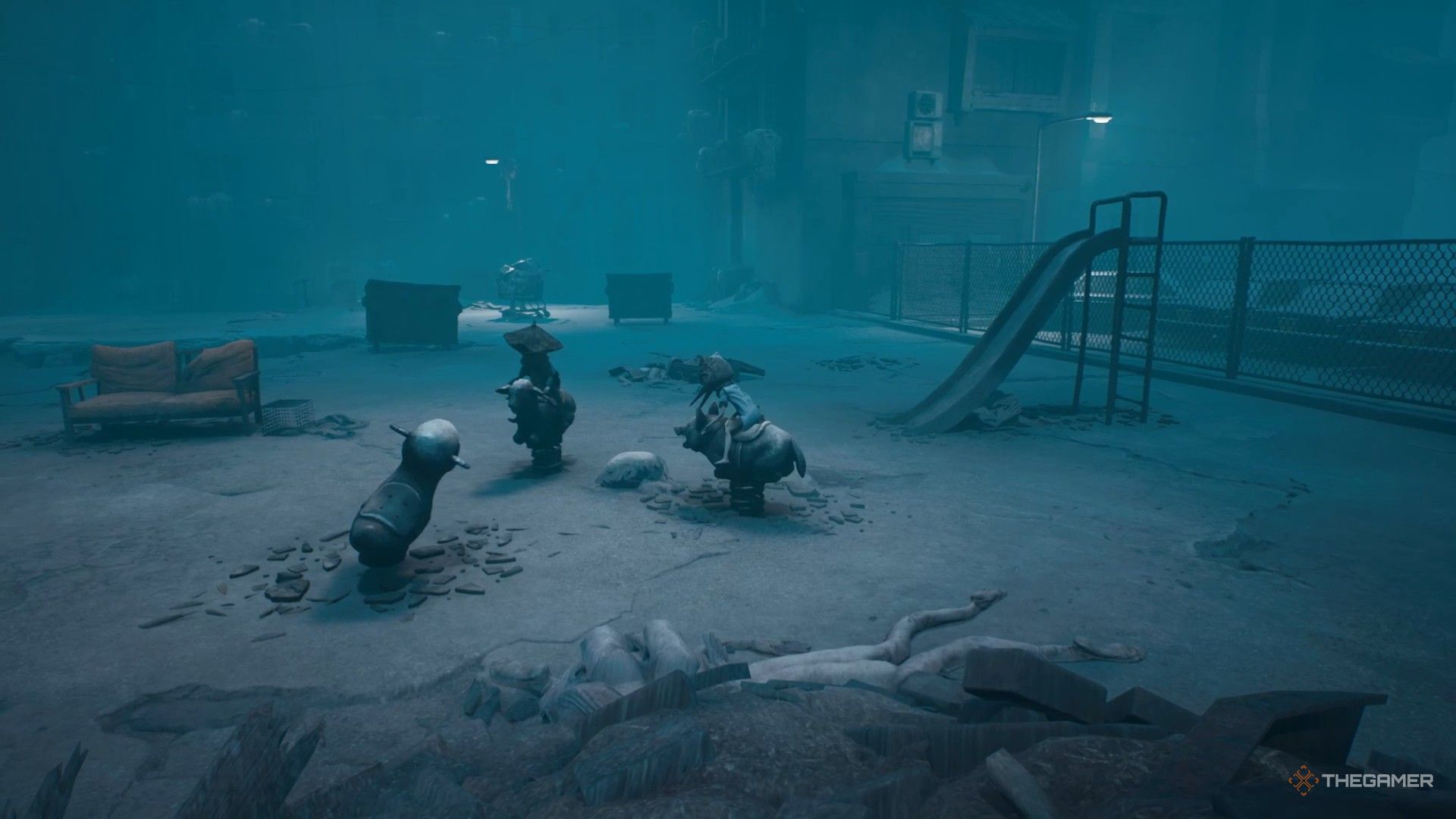 По мере продвижения местность расширяется после прохождения трещины и нескольких мусорных баков. Вы увидите большое здание со странными костюмами, висящими на балконах. На первый взгляд, здесь нет ничего очевидного, что нужно сделать, но если сдвинуть мусорный бак справа от гаражного пандуса вниз в здание, он откроет небольшую, разрушенную часть стены, через которую можно пролезть.