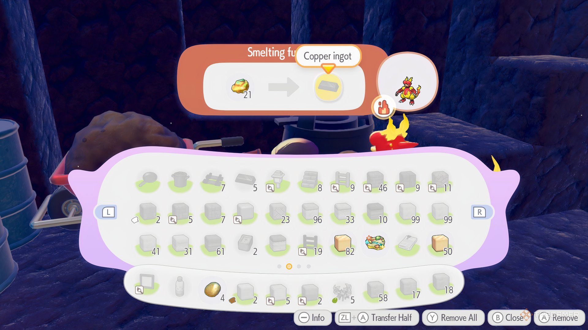 После сбора Руды вам потребуется переплавить её в Слитки для создания предметов и построек. Для этого потребуется Плавильная печь и Покемон, специализирующийся на огненных атаках. К счастью, несколько таких Покемонов уже находятся поблизости, чтобы помочь вам начать.