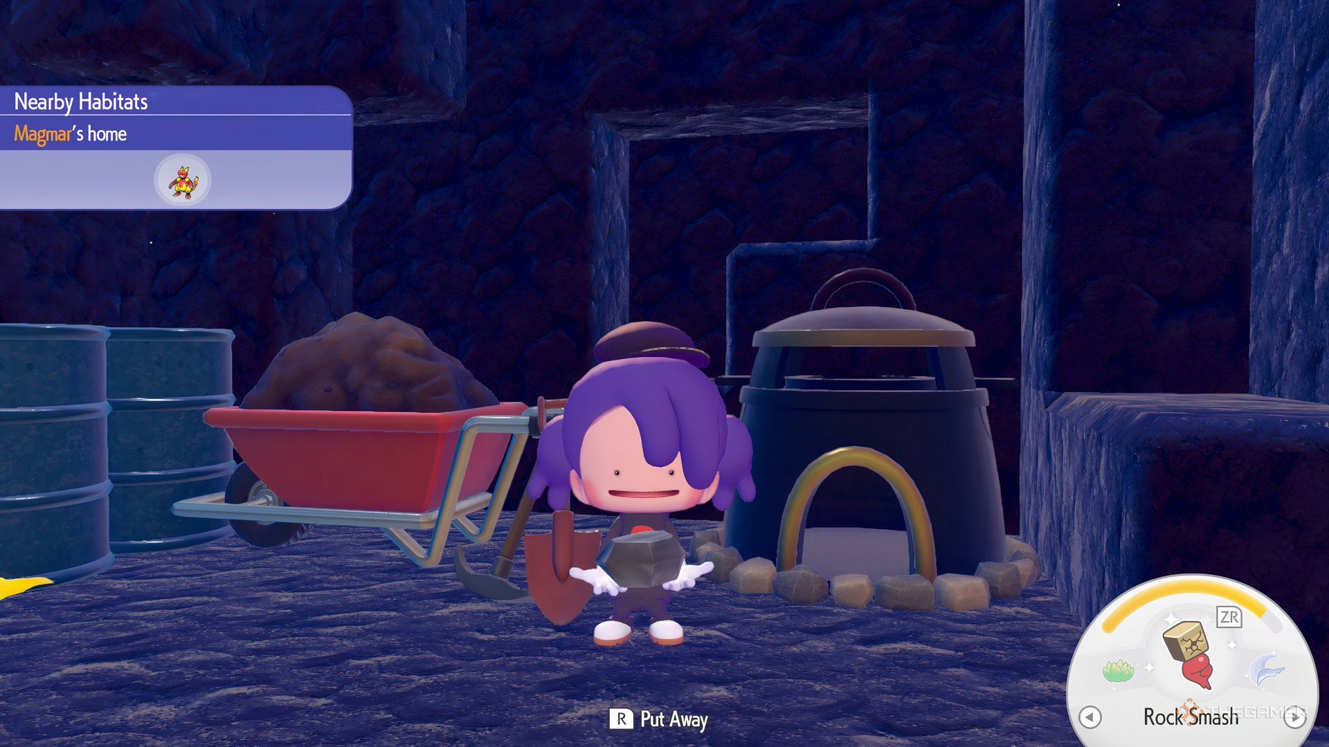 Чтобы создать эту конструкцию, поставьте тачку рядом с Плавильной Печью. Затем поместите маленькую лопату непосредственно перед ними обоими. Покемон должен появиться вскоре после этого. Пока вы ждете, вы можете исследовать пещеру дальше и переместить один из больших лавовых камней к краю лавового пруда, чтобы появился Charcadet – он будет знать прием Burn.