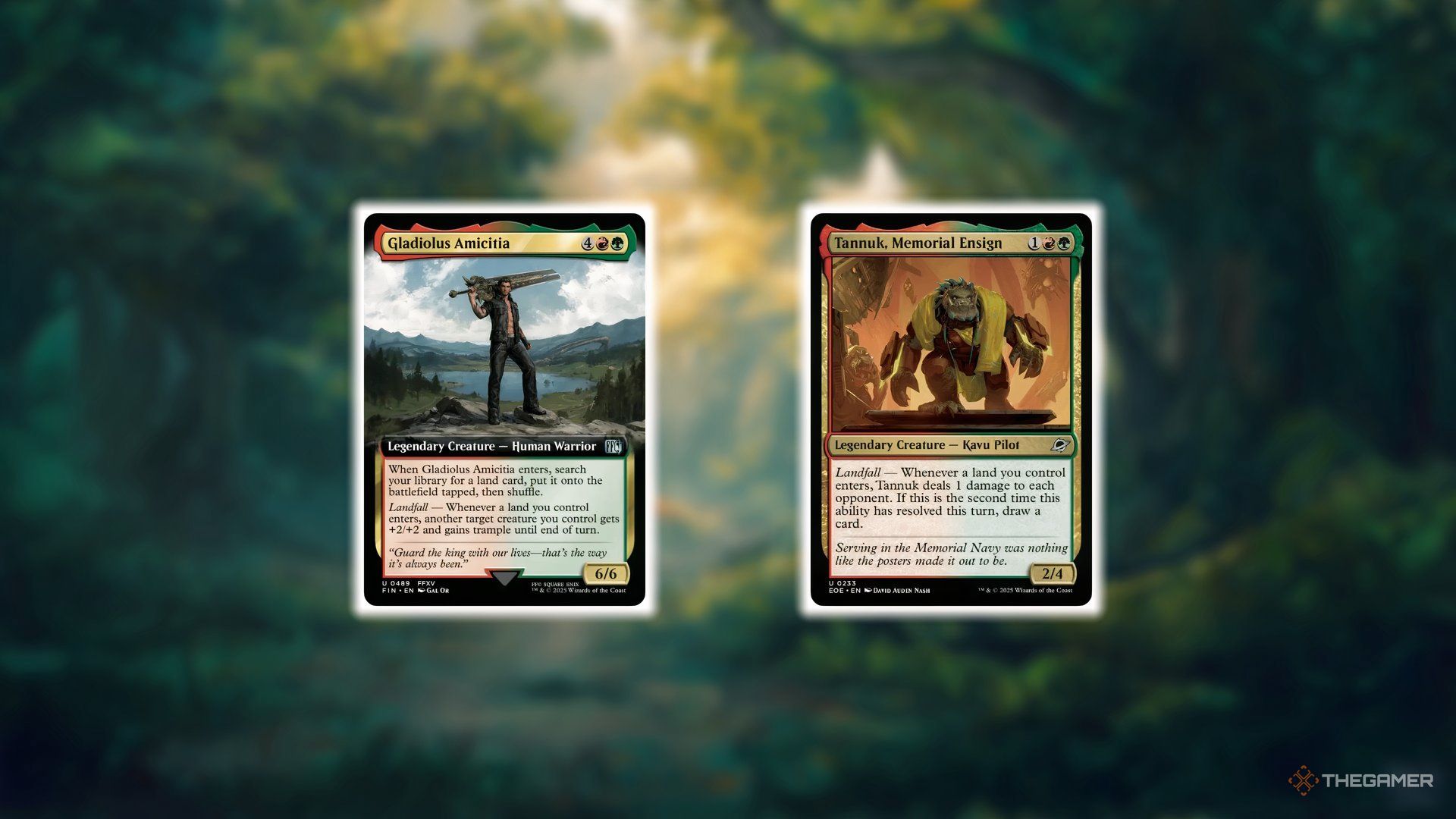 Чтобы сделать вашу колоду более интересной, рассмотрите возможность добавления карт, таких как Gladiolus Amicitia и Tannuk, Memorial Ensign. Поскольку это мощные легендарные существа, вам потребуется лишь несколько копий – возможно, одна или две – не сильно меняя требования к мане вашей колоды, хотя добавление пары дополнительных гор вместо лесов может быть полезным.