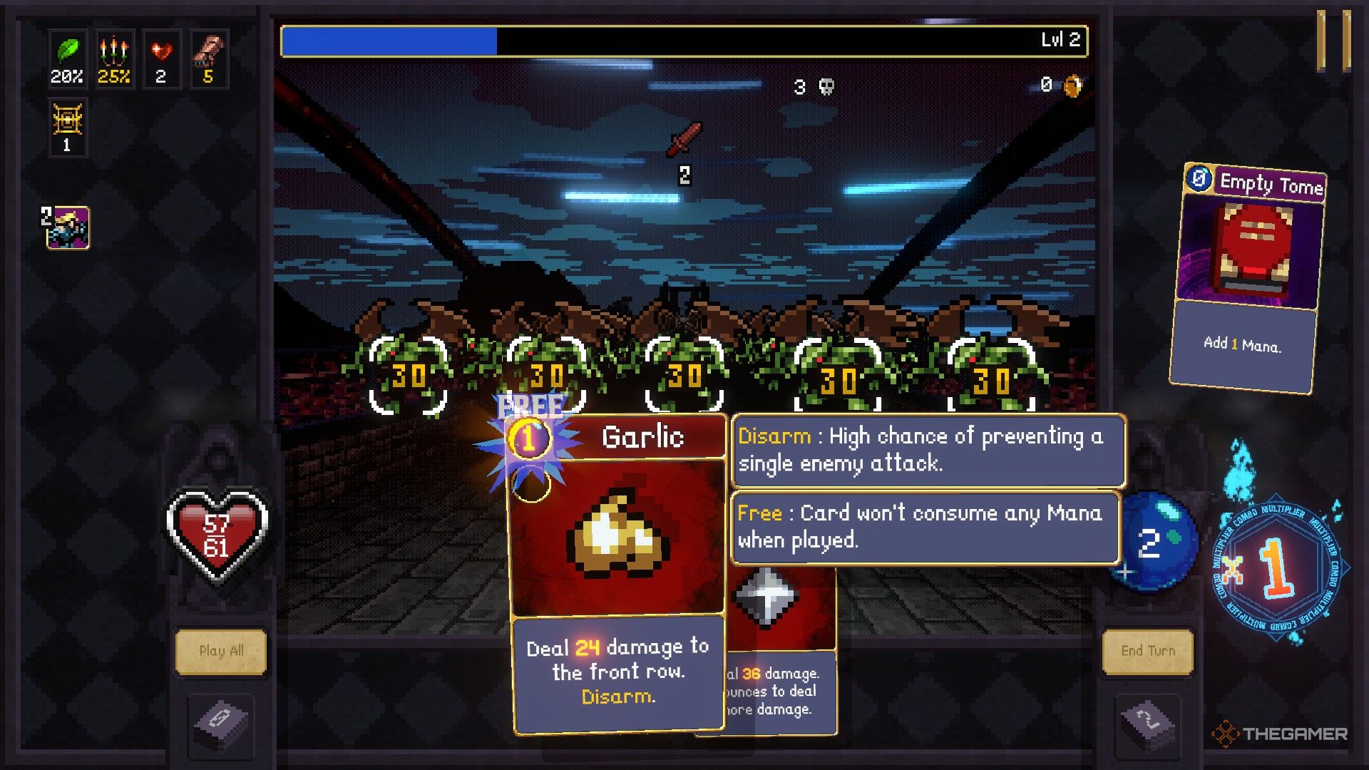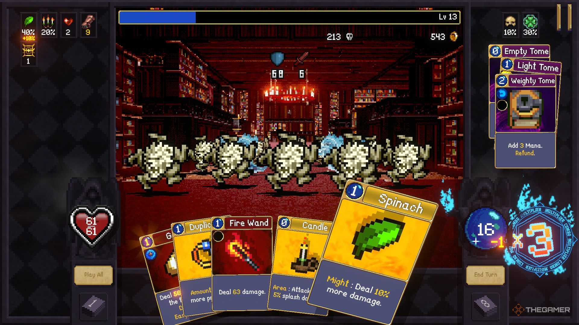 Чтобы создать комбо, разыгрывайте карты в порядке возрастания стоимости маны – начните с карты стоимостью 0, затем карту стоимостью 1, 2 и так далее. Эффект каждой карты будет усилен: эффект карты стоимостью 1 произойдёт дважды, эффект карты стоимостью 2 – трижды и так далее. Вы можете увидеть, во сколько раз будет умножен эффект каждой карты, посмотрев на индикатор множителя справа от вашей текущей маны.