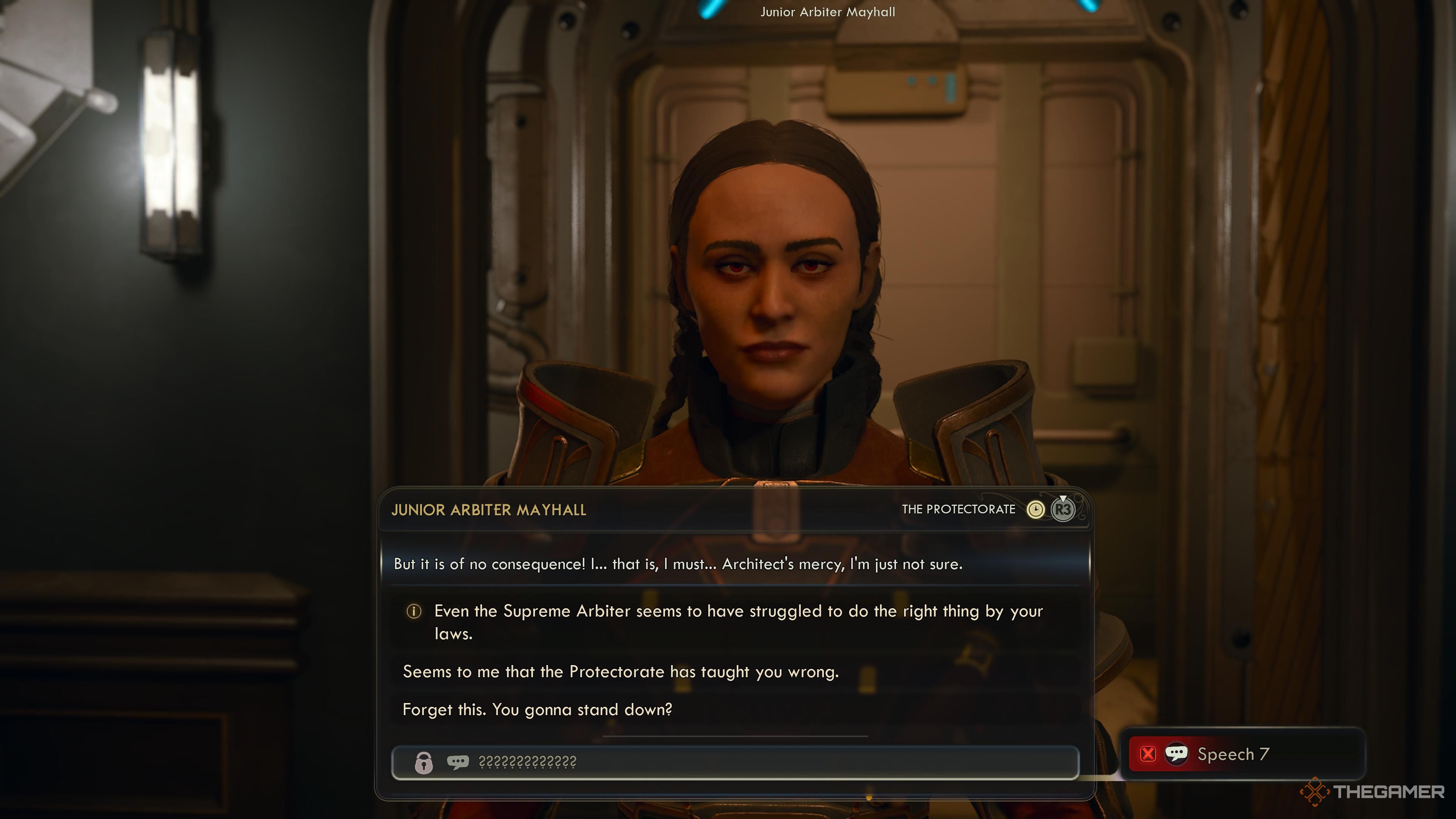 Прежде чем Тристан успеет полностью понять, что происходит, из лифта выходит младший арбитр Мейхолл. Они оба узнают друг друга. Как и предыдущий чиновник, Мейхолл знает, что Тристан здесь, и хочет взять его под стражу. Она предпочитает сделать это мирным путем, но она здесь, чтобы арестовать его за игнорирование официального вызова от Консула и нарушение закона Протектората.