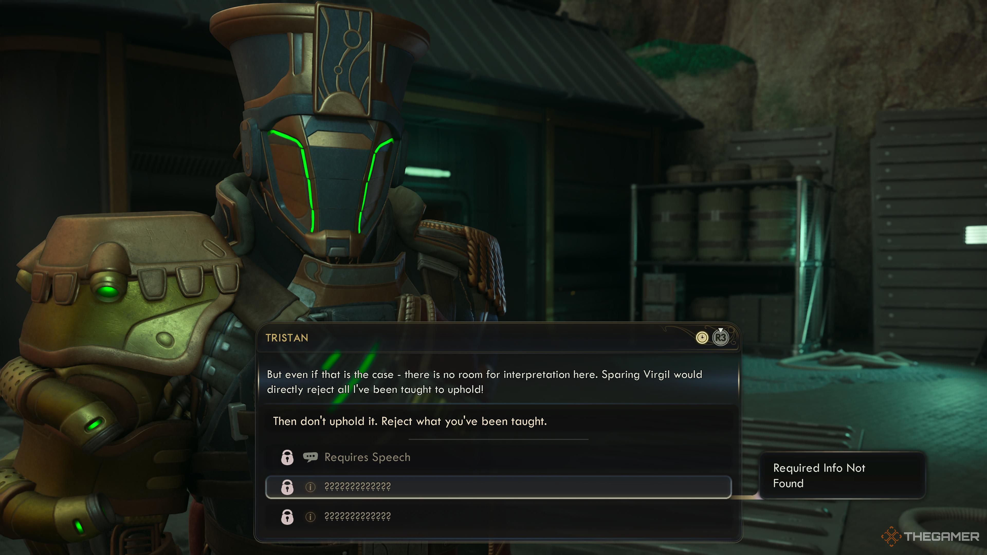 Окей, значит, я понял, что если я действительно прокачаю навык Речи – доведу его хотя бы до пяти пунктов – я смогу уговорить этого парня и спасти Вирджила! Это также заставит Тристана начать сомневаться в том, как действует Протекторат. Он не покинет их, но захочет, чтобы они улучшились. Если я не смогу этого сделать, то будет драка – против Вирджила и всех его друзей из Протектората. В любом случае, я получу Комплект Продвинутых Модификаций Тристана, который просто потрясающий!