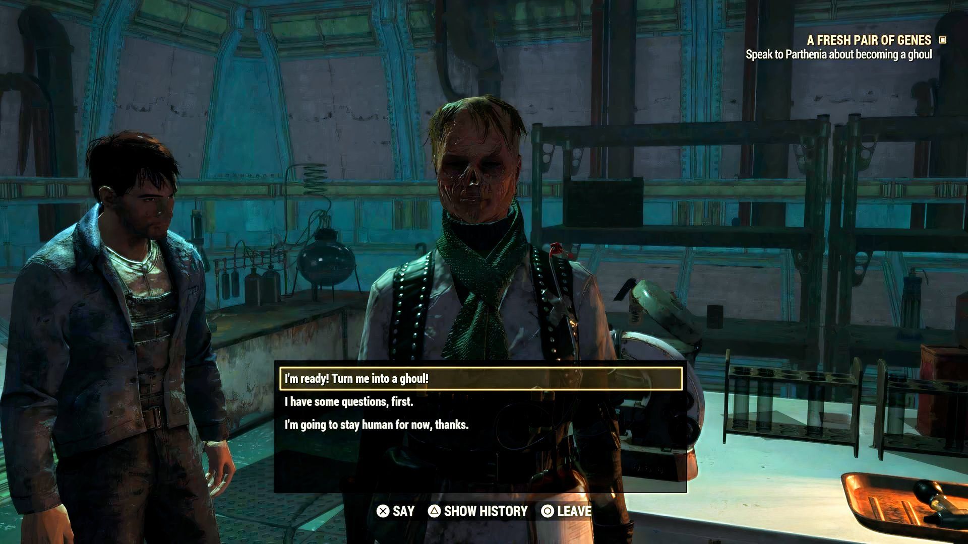 Окей, значит, если я хочу стать Гулем, мне нужно поговорить с Парфенией. Она укажет мне на ингалятор, лежащий на столе. Как только я его использую, меня бросают в радиационную камеру и бац – я Гуль! На самом деле, всё довольно просто.