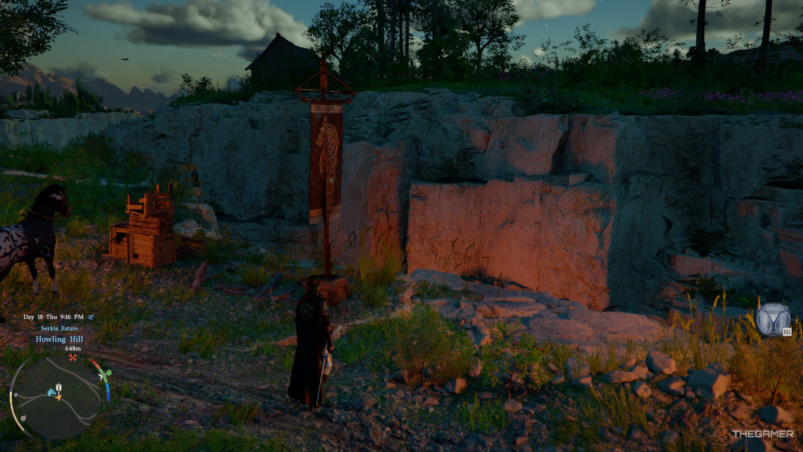К этому моменту у вас должен быть кирка. Если нет, вы можете найти её возле деревянного столба рядом со скалами. Как только вы её получите, откройте колесо быстрого выбора и перейдите в раздел снаряжения. Затем, перебирайте снаряжение в верхнем левом углу, пока не выберете кирку.