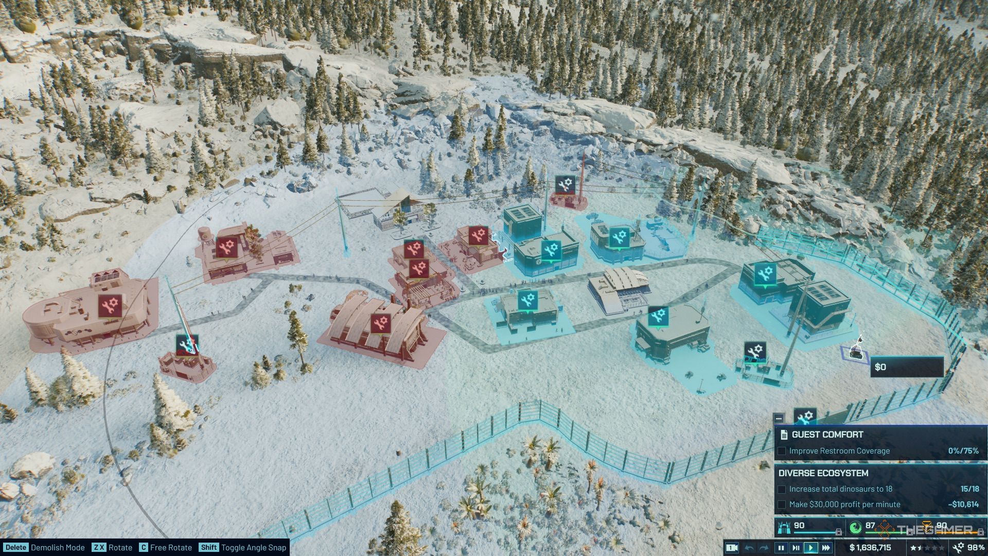 Служба обслуживания парка заботится обо всем, что обеспечивает его работу, от заборов и зданий до топлива и энергии. Вы можете проверить общее состояние парка, посмотрев на значок шестеренки в левом нижнем углу. Этот значок отображает процент, показывающий, насколько прочной и здоровой является инфраструктура парка. Если этот процент падает ниже 80%, вы можете начать испытывать проблемы и неисправности.