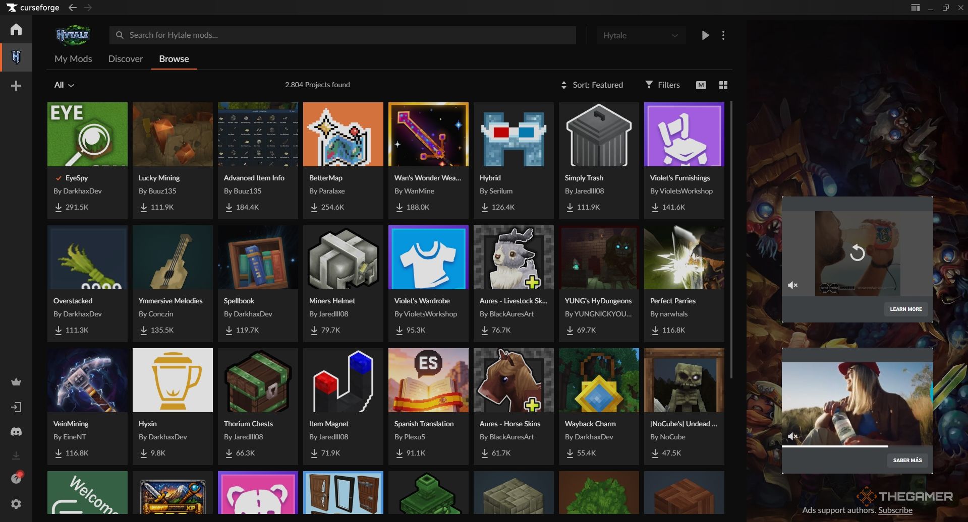 Вы также можете находить и устанавливать моды для Hytale непосредственно в приложении CurseForge, используя вкладку Browse в меню Hytale.