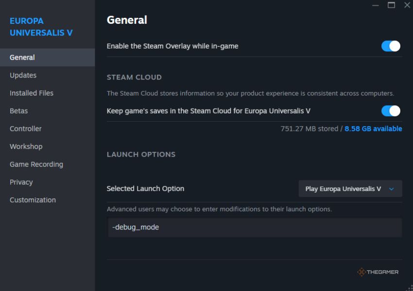 Чтобы включить режим отладки, откройте Steam, щелкните правой кнопкой мыши по Europa Universalis 5 и выберите «Свойства». Затем в поле «Параметры запуска» введите `-debug_mode` (без кавычек).